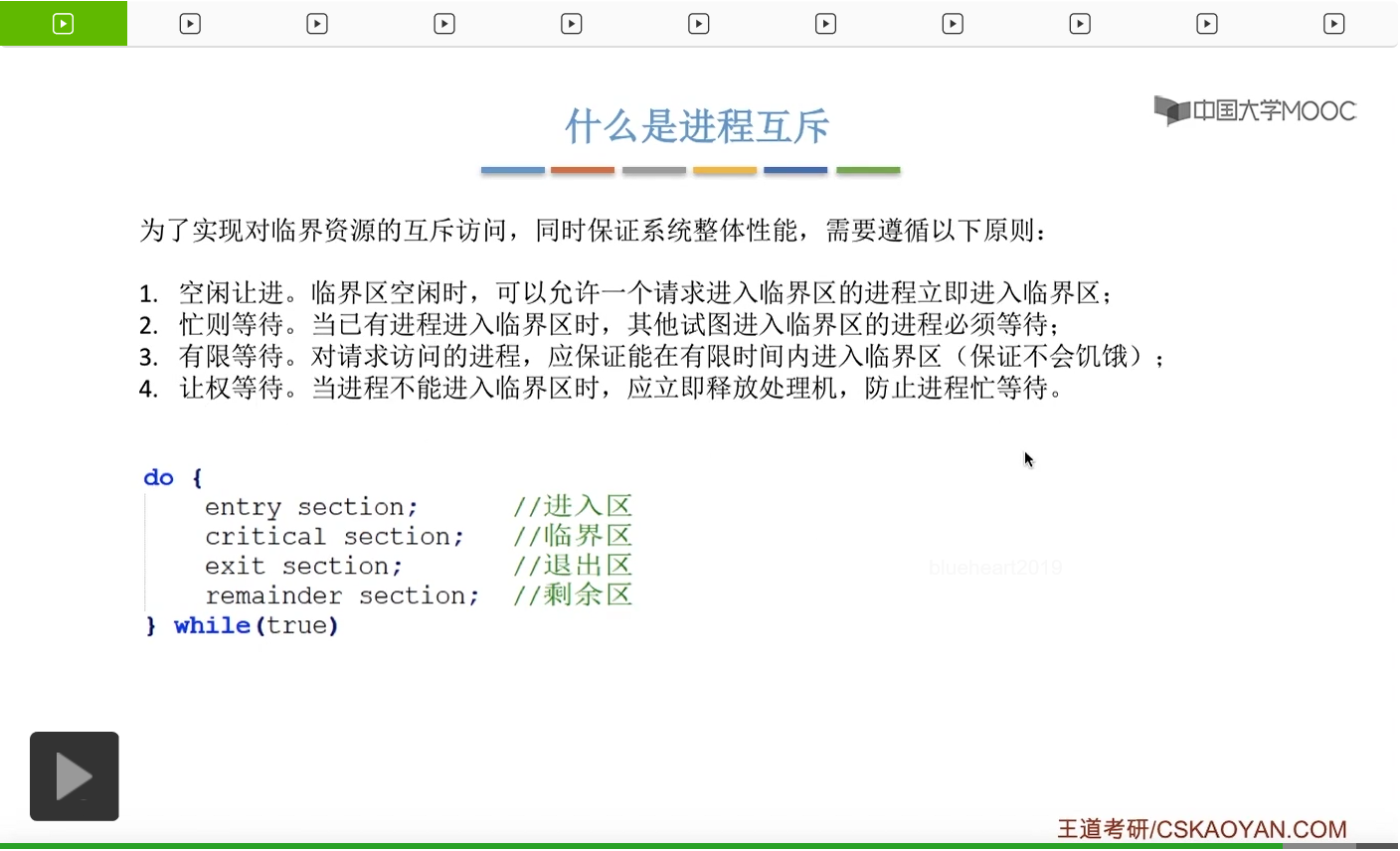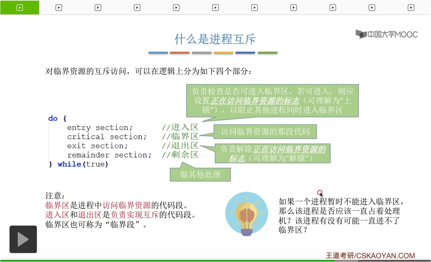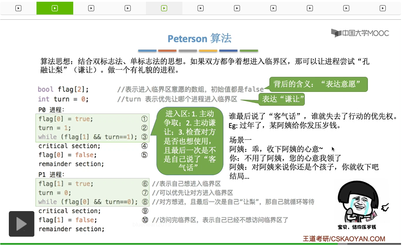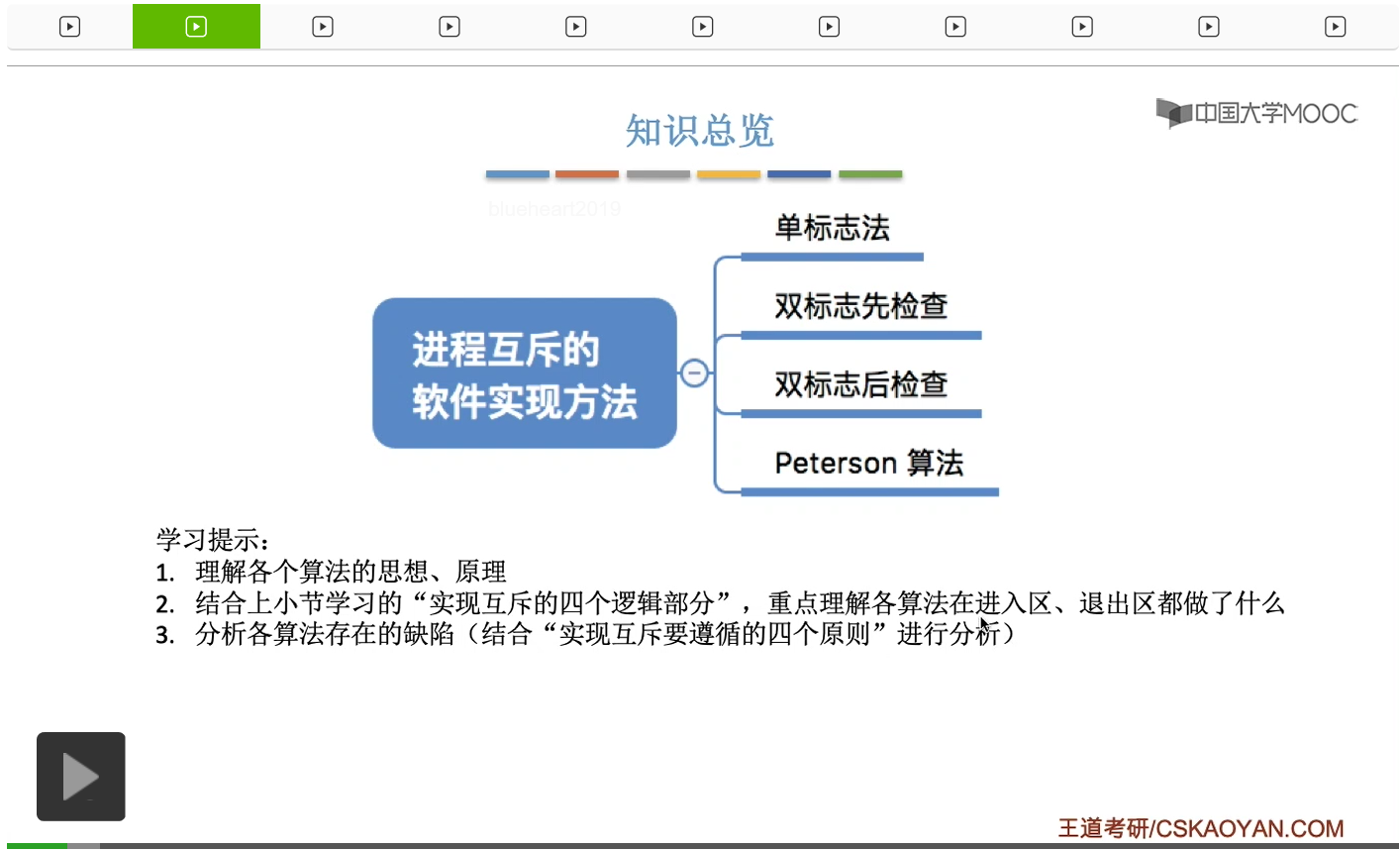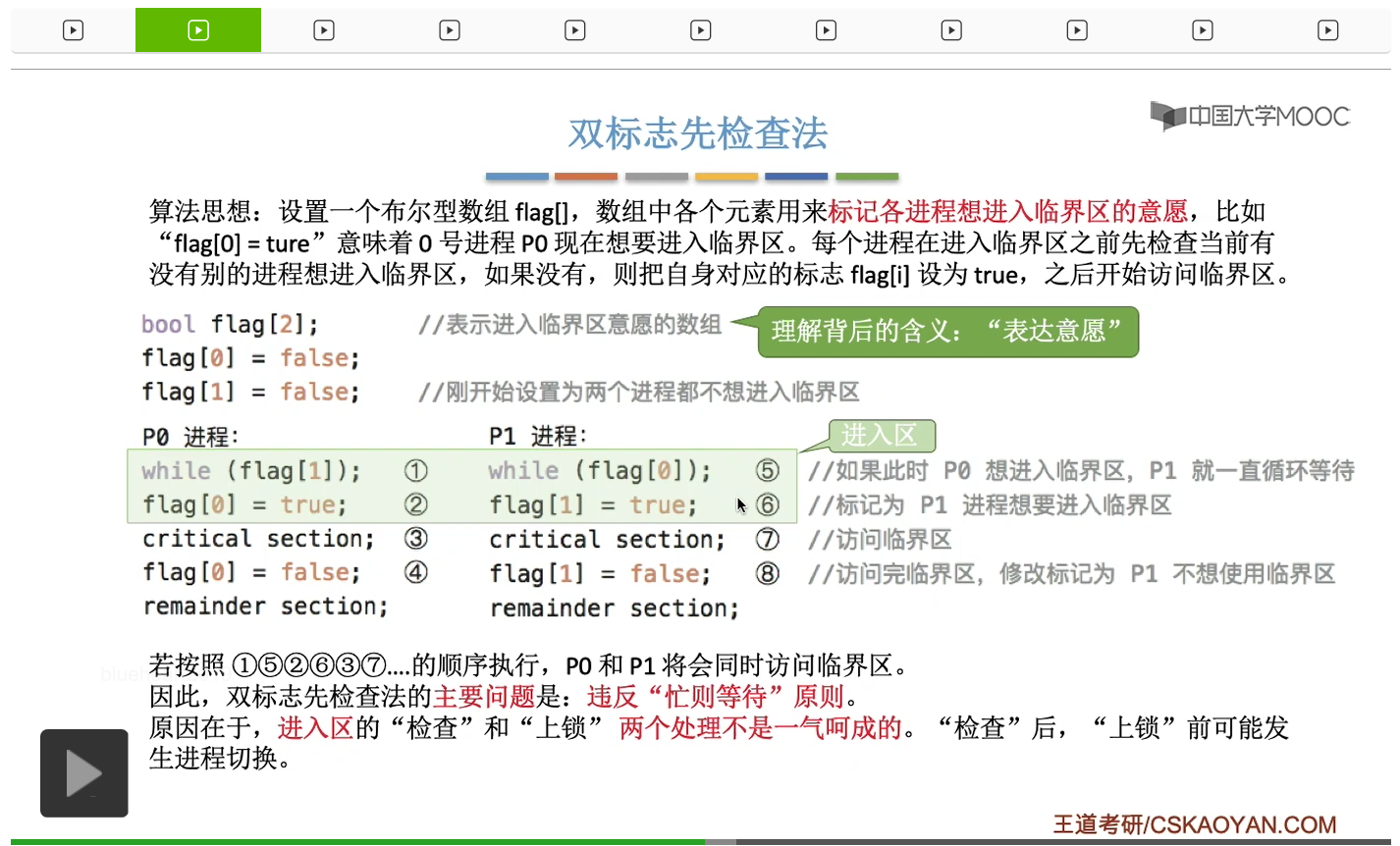 这个小节的考察频率总体来说还是很高的,经常会在选择题甚至大题当中进行考察,所以这个小节的内容十分重要。结合“实现互斥要遵循的四个原则”——空闲让进、忙则等待、有限等待、让权等待进行分析各算法存在的缺陷。