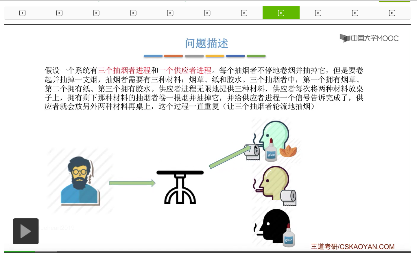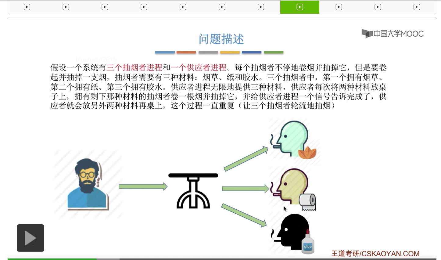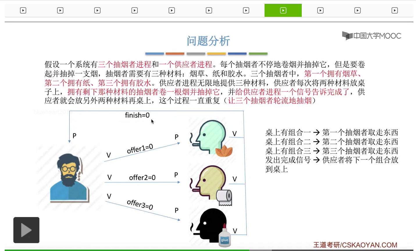 在这个小节中我们会学习一个进程同步互斥的问题,叫做吸烟者问题。