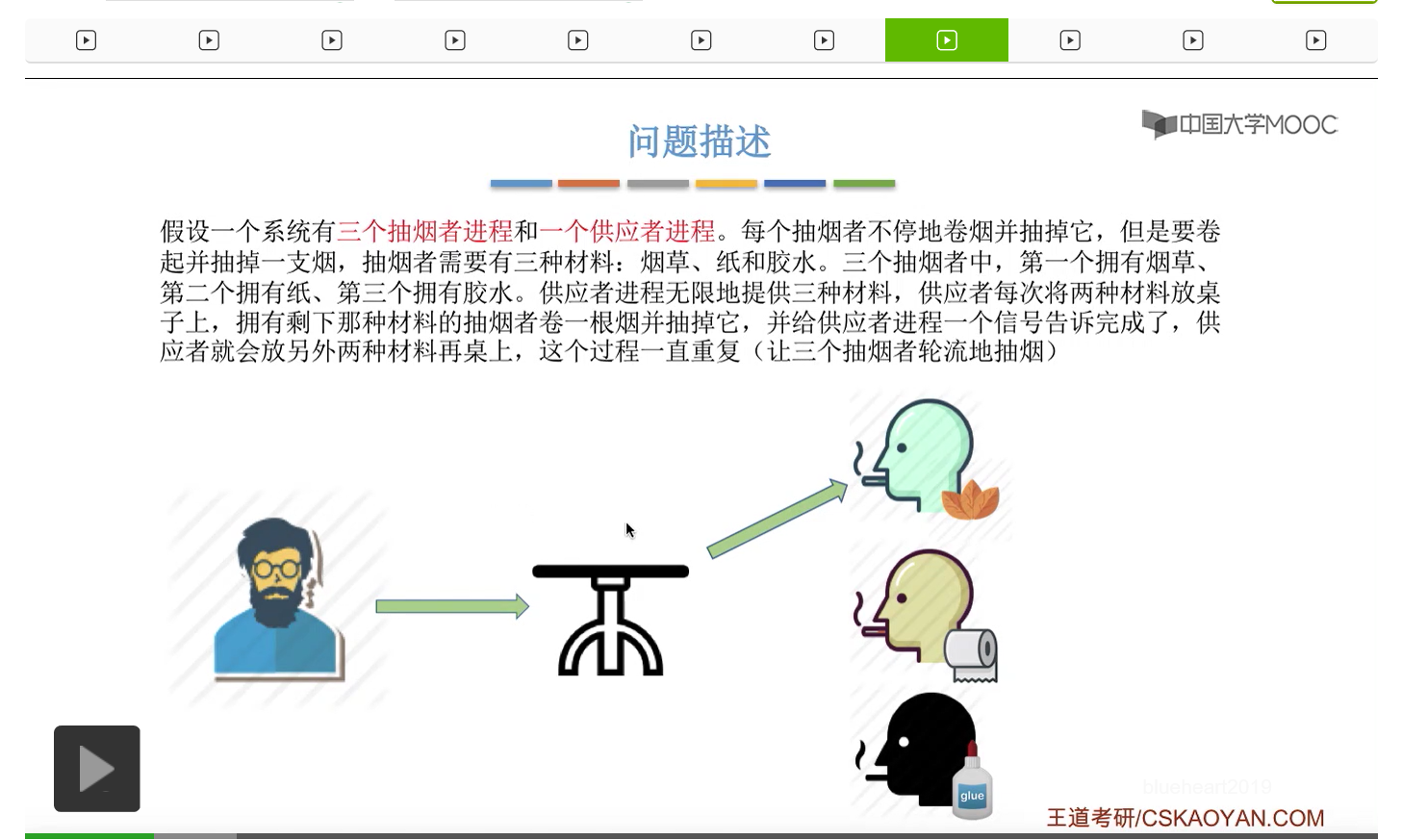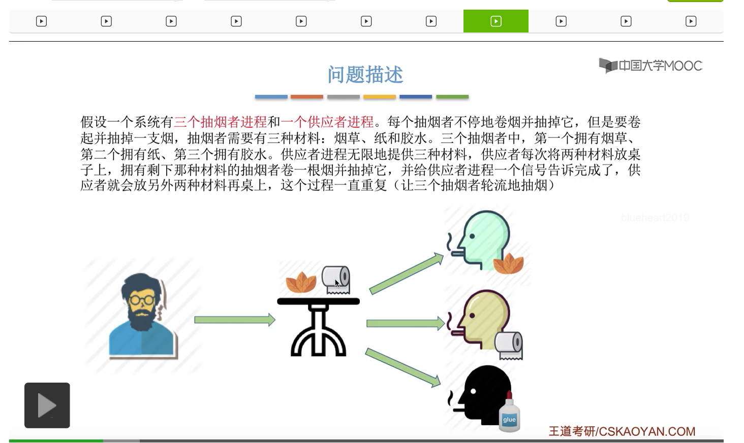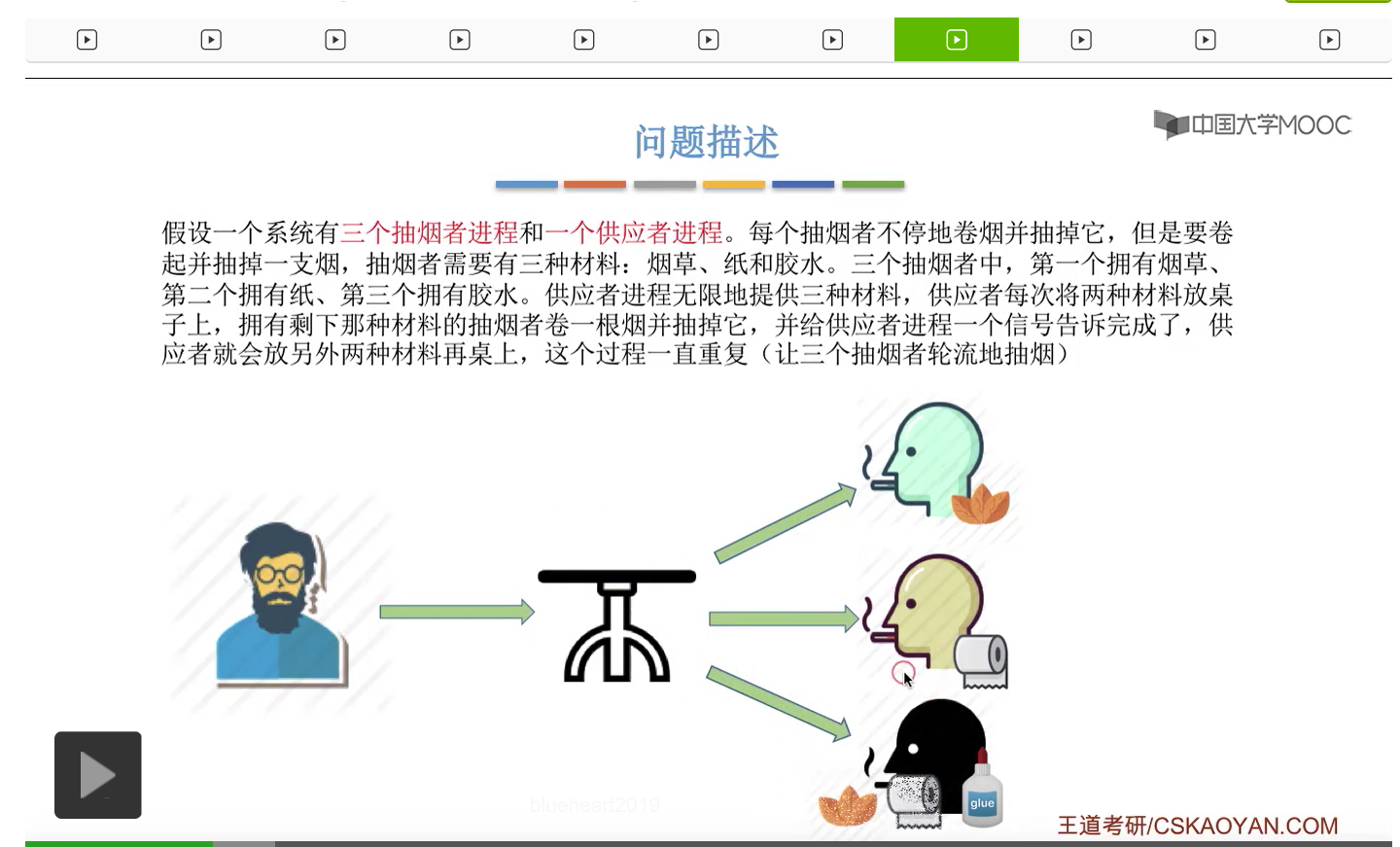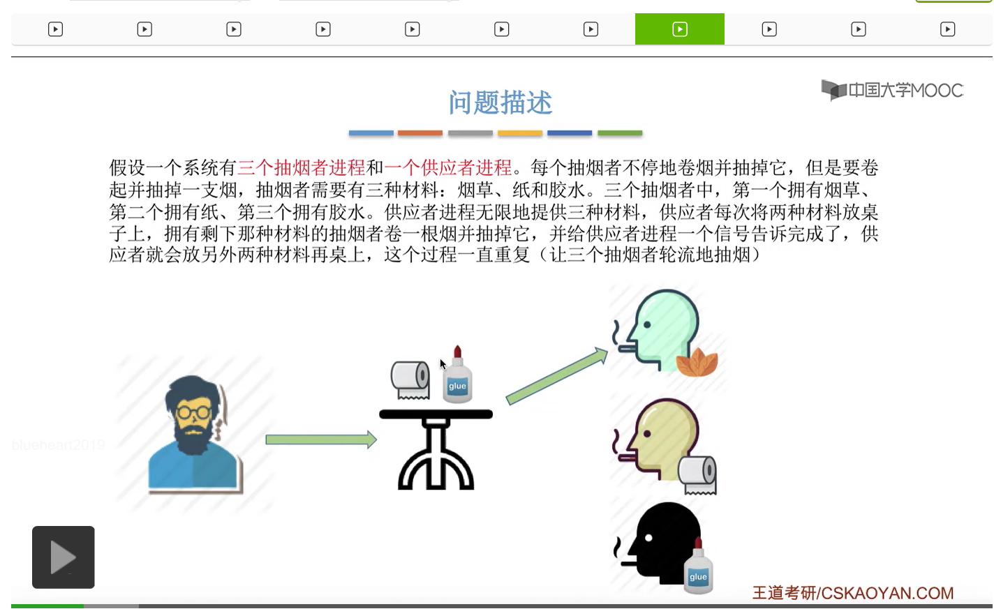 在这个小节中我们会学习一个进程同步互斥的问题,叫做吸烟者问题。