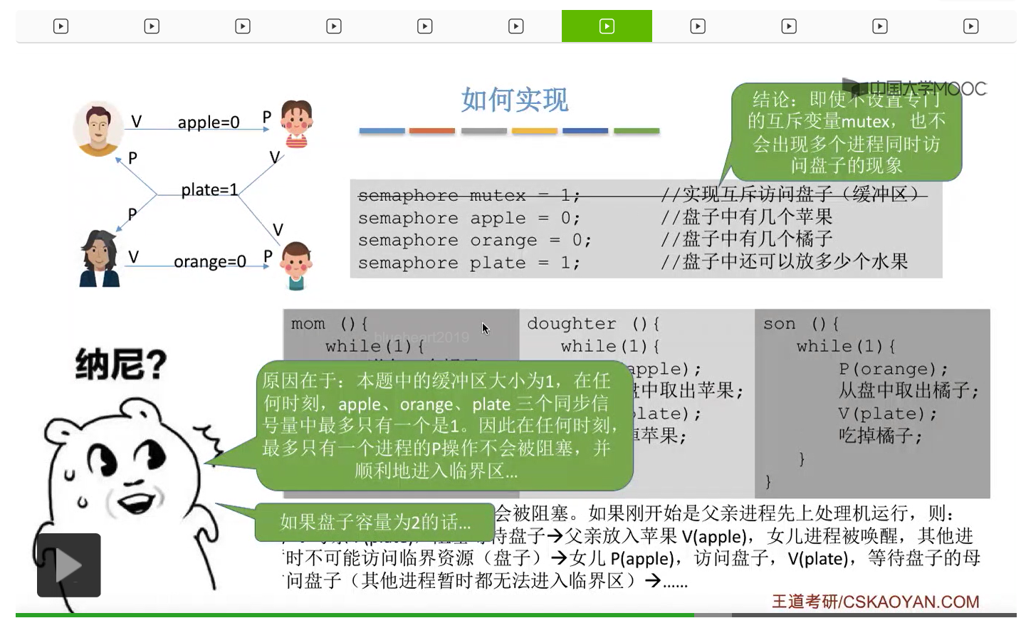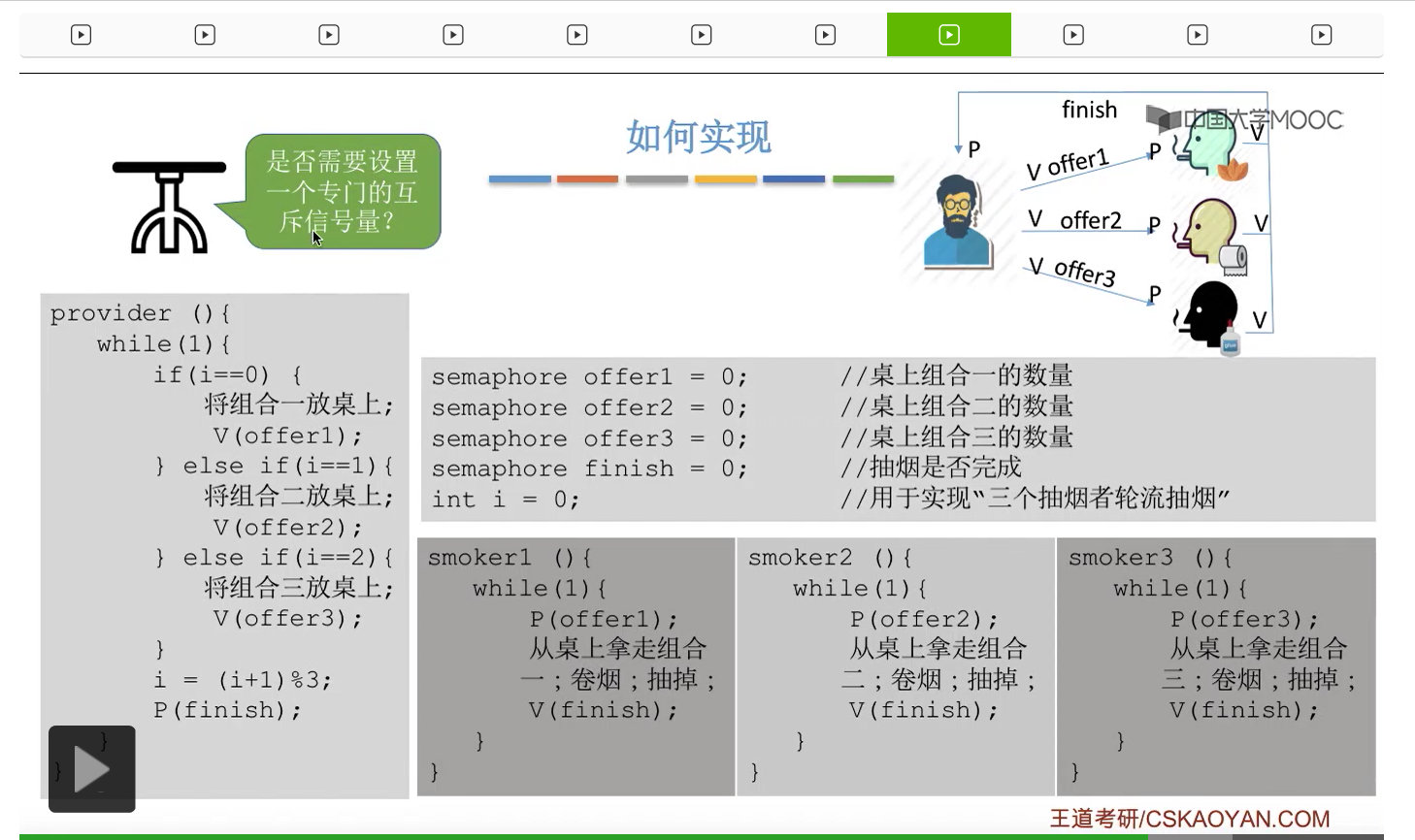 那這個地方大家再結合這些代碼來分析一下到底是不是需要專門地設置一個互斥信號量才可以保證各個進程它們互斥地訪問桌子這個緩衝區呢?其實如果經過分析之後大家會發現,這些信號量同一時刻只會至多只有一個的值可能是1,也就是說這四個進程在同一時刻最多只會有其中的一個不被這個P操作所阻塞,可以順利地進入桌子這個臨界區。那這個地方感興趣的大家可以自己再推一下。