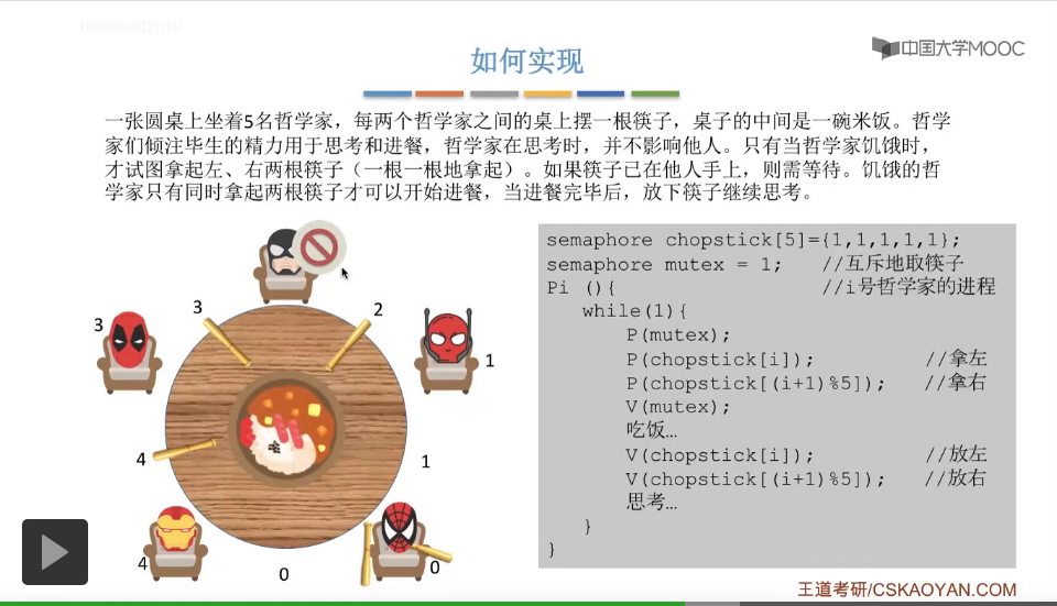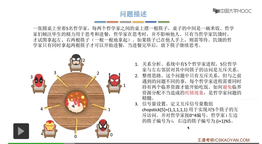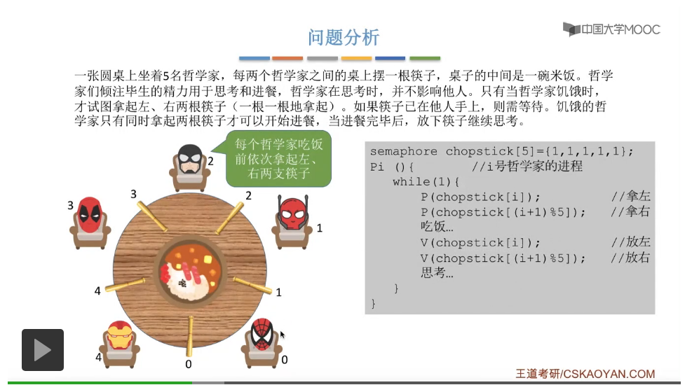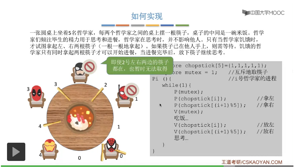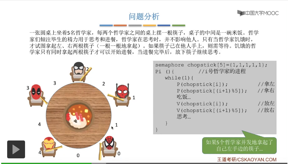 在这个小节中我们会介绍进程同步互斥的最后一个经典问题——哲学家进餐问题。