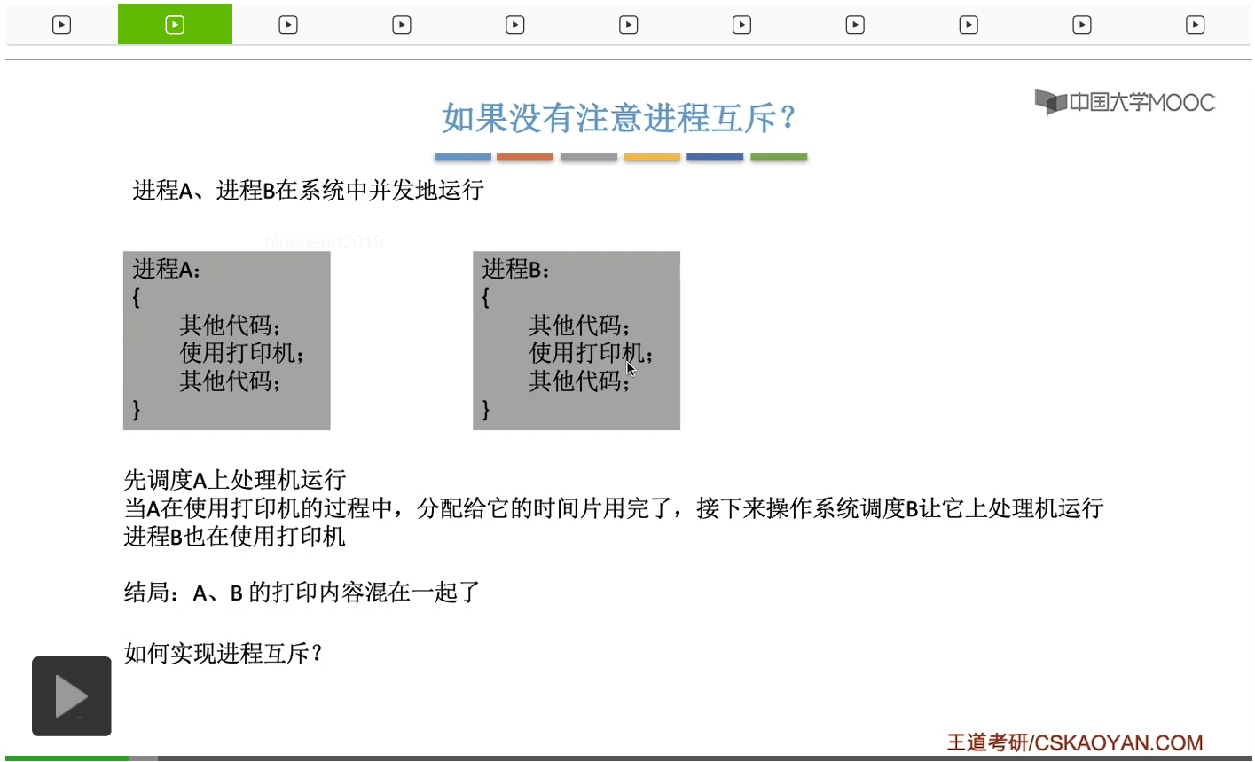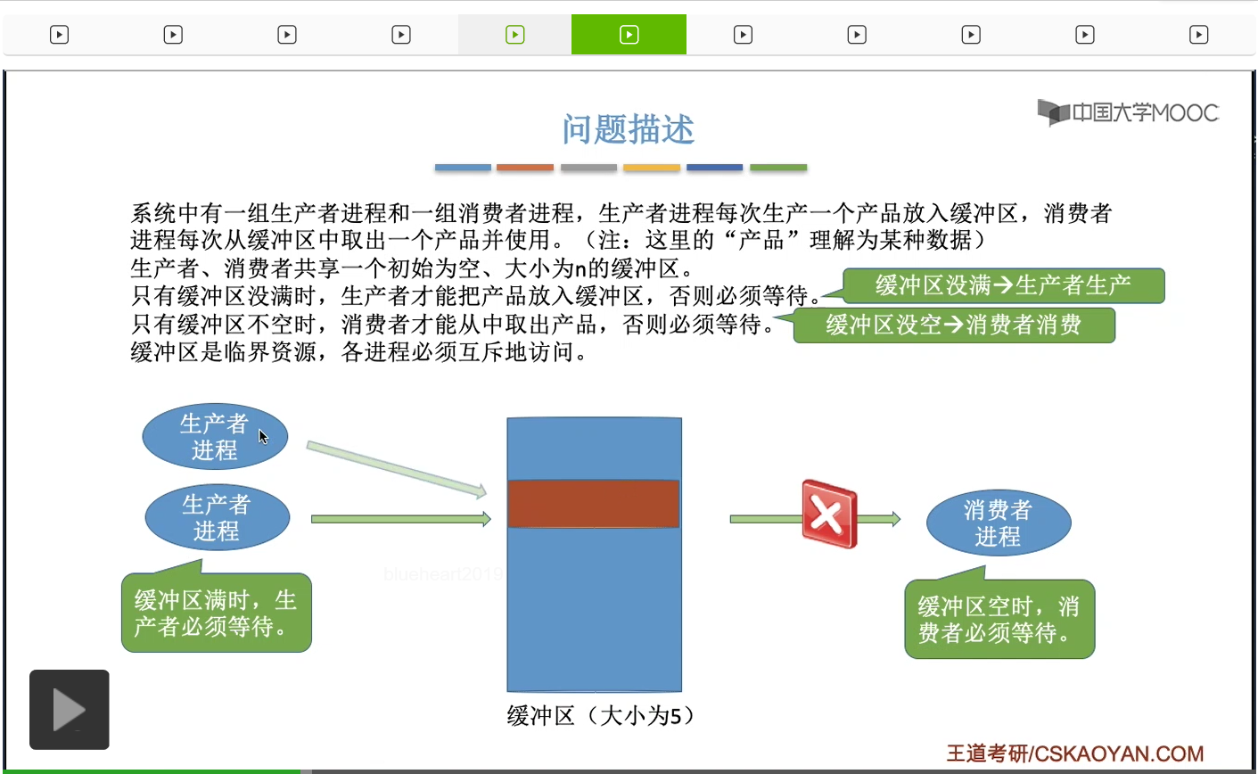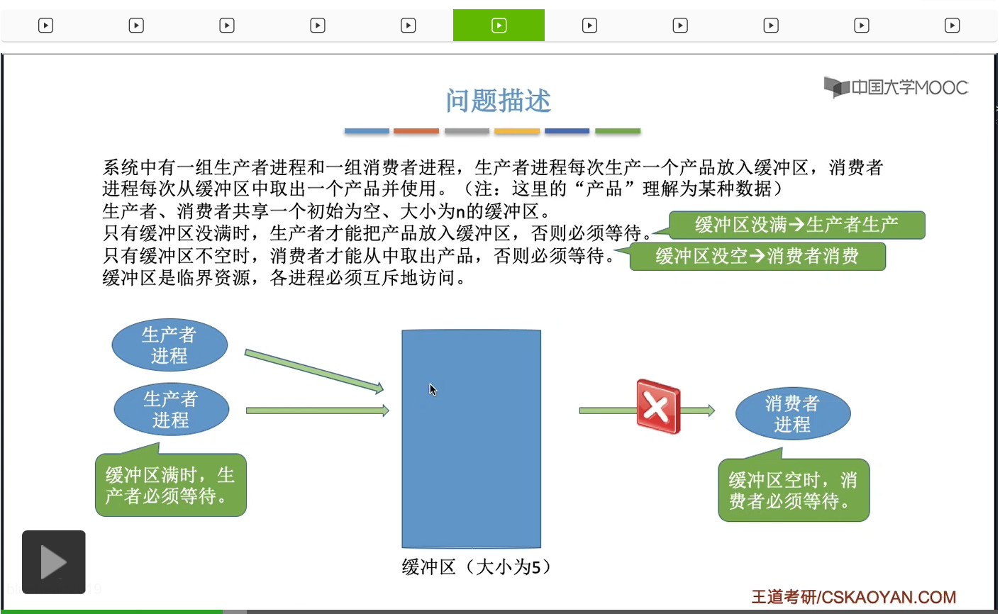 如果各个进程同时访问缓冲区的话,那么有可能会出现一系列的问题,比如说刚才我们提到的数据覆盖,所以缓冲区这种资源它是一种临界资源,各个进程必须互斥地访问。那么既然需要互斥地访问,这其实就是我们之前学过的互斥的问题。