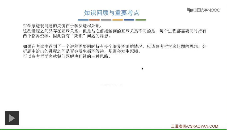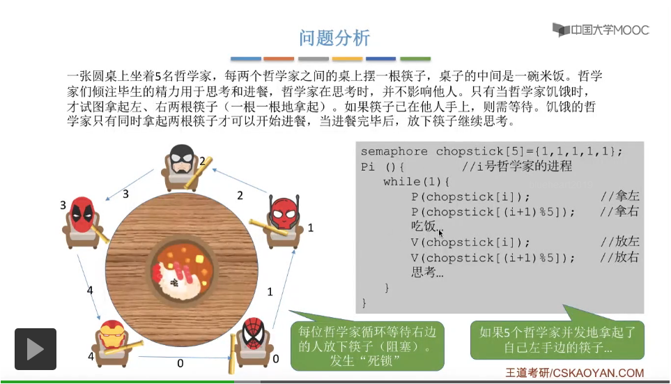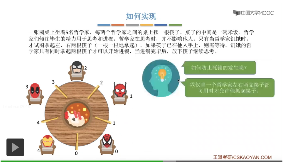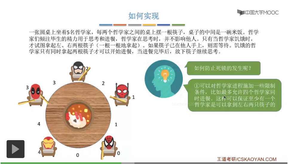 那么我们在学习哲学家进餐问题的时候,最关键的地方就是要理解它解决进程死锁的这种思想。而具体死锁什么时候会发生,死锁的发生又需要一些什么样的条件,这个在之后的小节当中还会有更详细的说明。