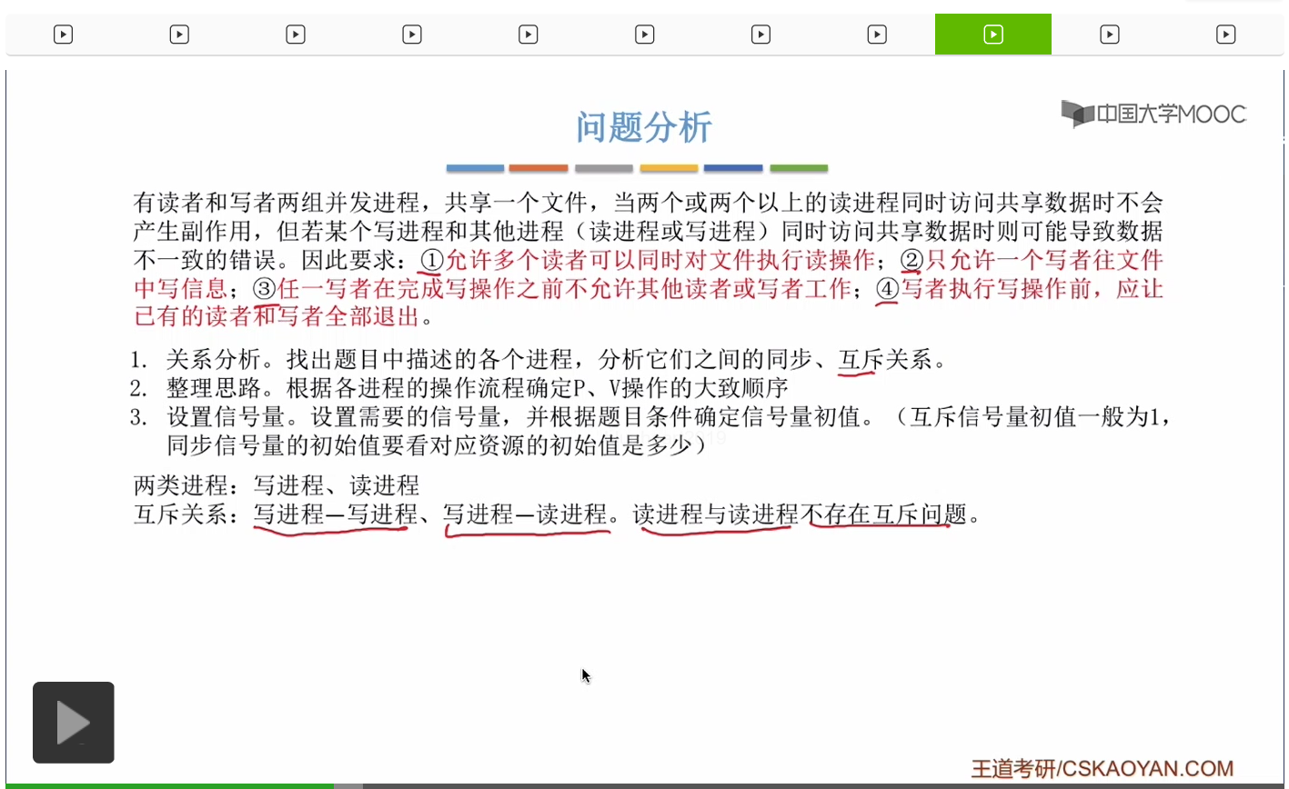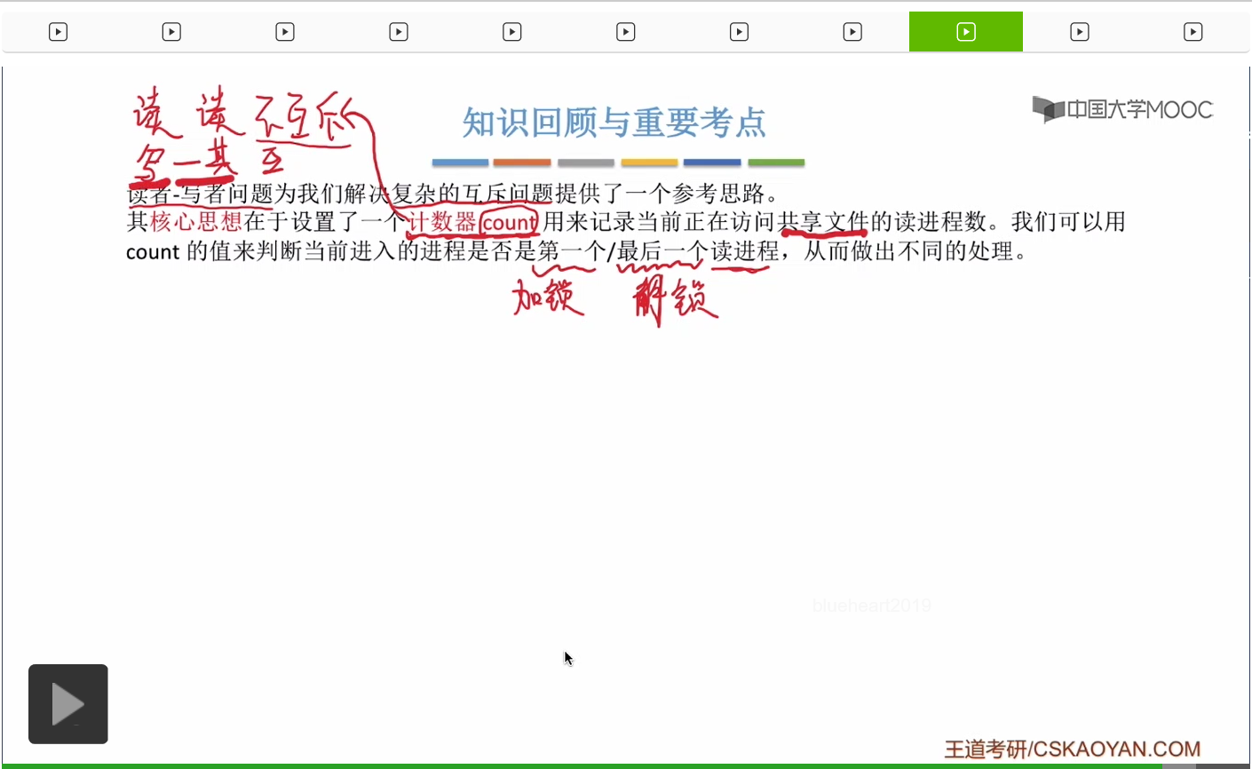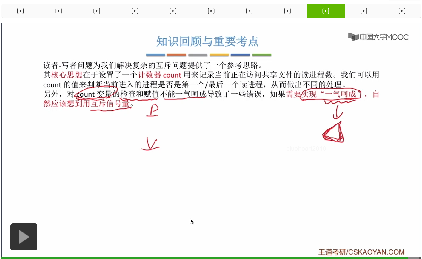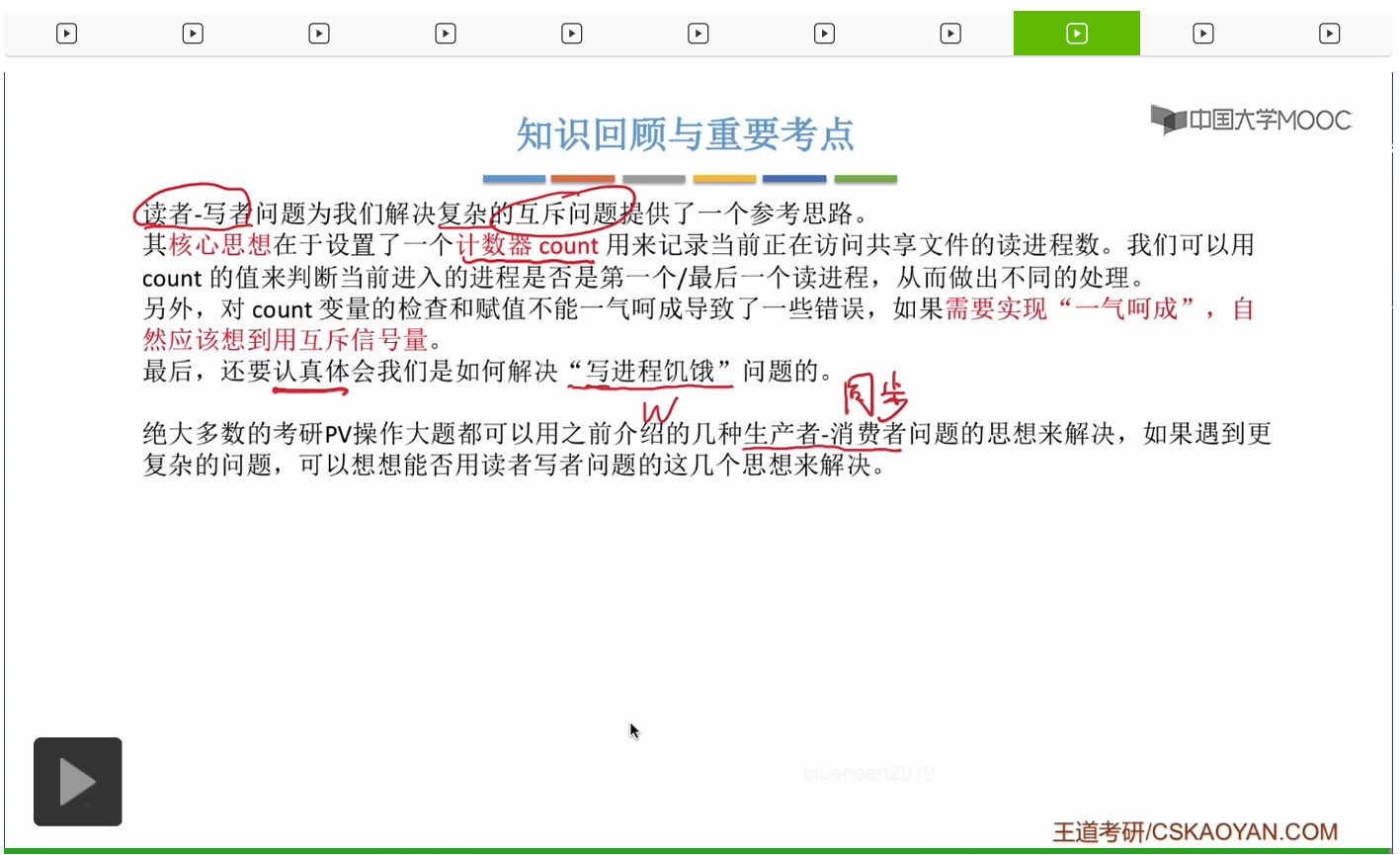 那我們在考研當中遇到的絕大多數PV操作的大題,其實都可以用我們之前學到的生產者-消費者的那種思路來解決。不過有的時候我們確實有可能會遇到像讀者寫者這種很複雜的互斥的問題。當我們遇到同步問題的時候,我們更多的應該參考的是這個生產者-消費者這種模型的思想,而當我們遇到複雜的互斥問題的時候,我們應該想到的是這個讀者-寫者問題,想想它是怎麽用這個計數器count來實現複雜的互斥規則的。