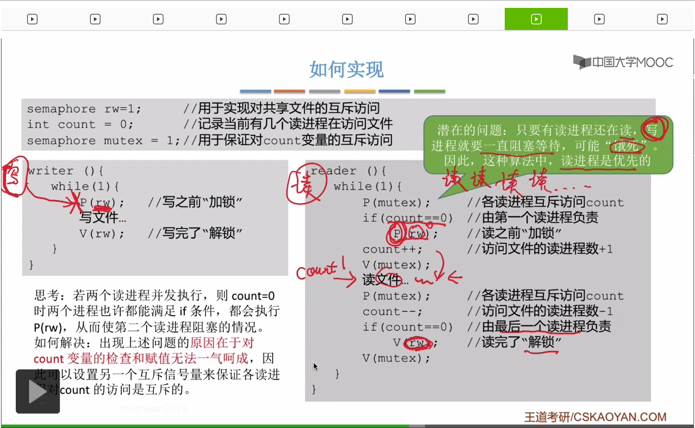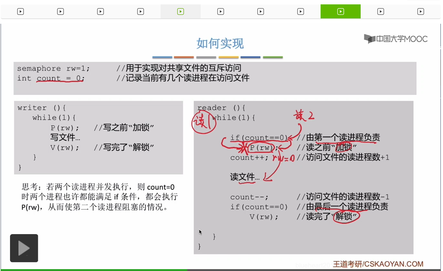 不過這個方案也存在一個問題,我們來深入思考一下,如果兩個讀者進程它們并發地執行的話,剛開始如果count的值是零,那麽讀者1當它在執行到這個判斷語句的時候發現此時count的值是零,所以這個條件滿足因此讀者1接下來會執行這個P操作。那如果此時切換成了讀者2進程,那這個進程它在執行這一句條件判斷的時候也會發現count的值此時是零,所以這個條件也滿足,因此讀者2接下來也會來執行這個P操作。所以讀者2對rw執行了P操作之後,rw的值就變爲了0,那接下來如果再切換回讀者1這個進程的話,它在執行這個P操作的時候,會發現rw已經為零。這個讀者1就會被阻塞在這個地方。因此這種情況下雖然讀者2已經可以開始讀文件了,但是讀者1又被阻塞在了這個P操作這兒。