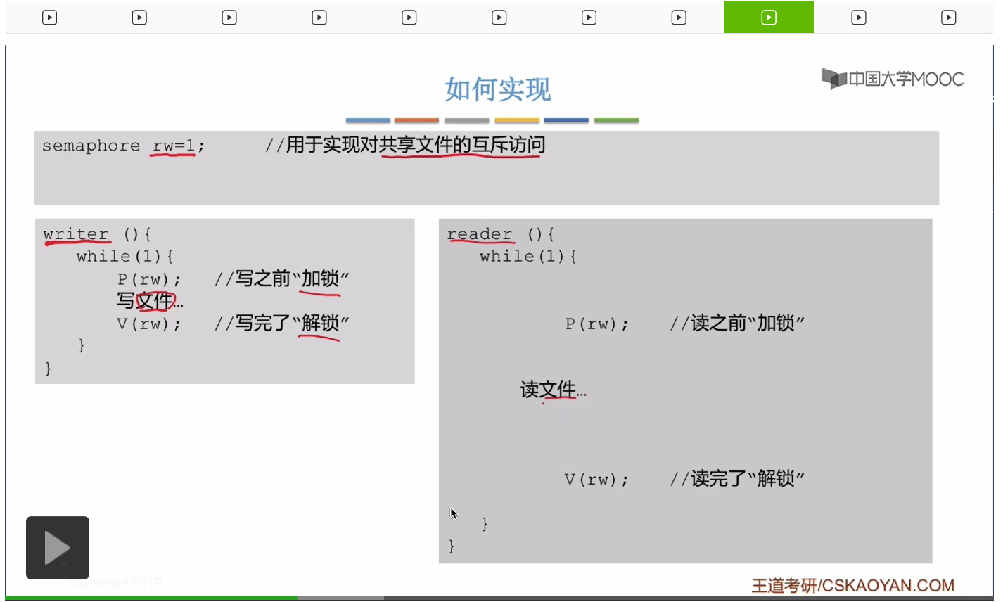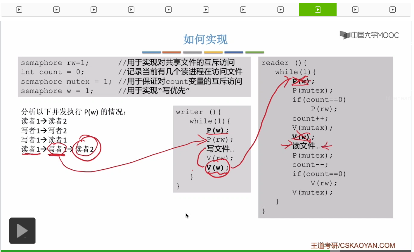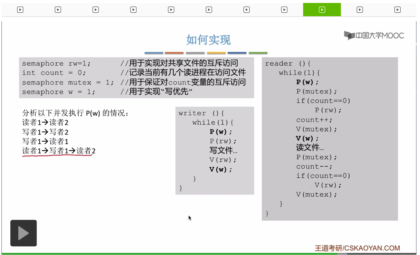 那在之前信號量機制那個小節當中我們講到過,信號量除了這個數字表示資源之外,它還有一個功能就是排隊的功能,由於這個讀者先對w執行了P操作,所以這個讀者它會排在w這個互斥信號量後面的這個隊列當中,它屬於隊頭的位置。而接下來這個寫者進程2它是之後對w執行P操作的,所以寫者進程2它會被排在讀者進程之後。因此當第一個寫者在寫完文件并且對w這個互斥信號量執行V操作的時候,它喚醒的其實是讀者,而不是之後到來的寫者。因爲讀者排在這個w信號量的隊頭,而寫者是之後才會被喚醒。