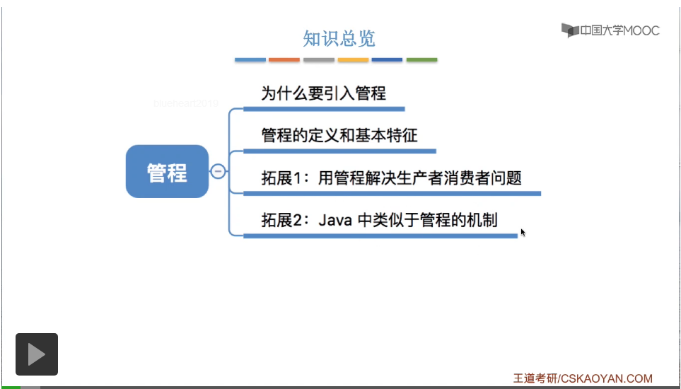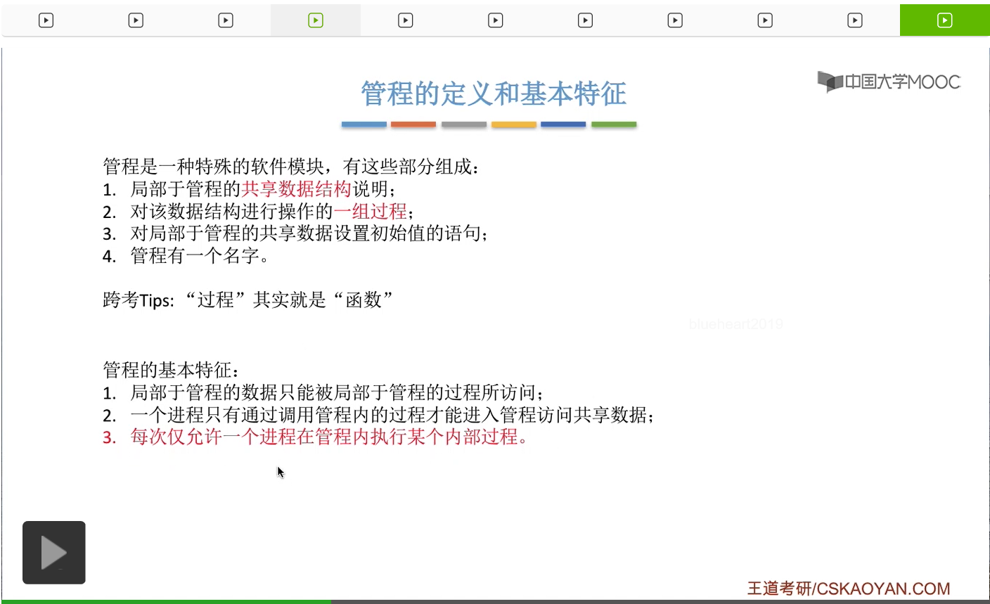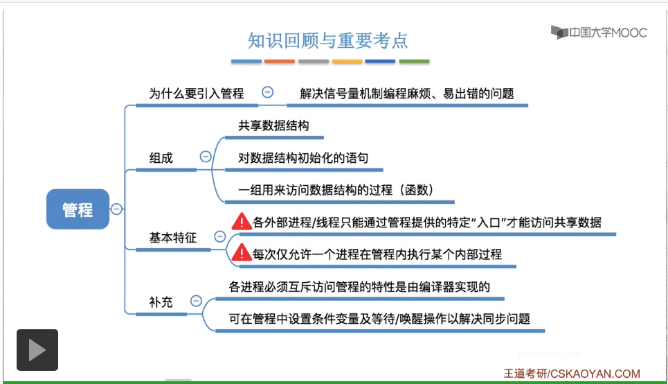 管程其实无非也就是为了实现进程的同步和互斥,只不过是实现起来会更方便一些。另外,我们介绍了管程的组成和基本特征,在考试当中最容易考察的其实是管程的这两个基本特征。首先,外部的进程或者线程只能通过管程提供的特定“入口”,这个“入口”其实也就是管程当中定义的某一些函数或者说过程才可以访问管程当中定义的那些共享数据。另外呢,每一次仅允许一个进程在管程内执行某个内部过程,那这两点是最容易在选择题当中进行考察的。另外,我们补充了两个知识点:各进程互斥访问管程的特性其实是由编译器负责实现的,程序员并不需要关心。另外,可以在管程当中设置条件变量还有等待唤醒操作就可以解决管程的同步问题。那管程其实就是应用了封装的思想,把进程同步、互斥这些复杂的细节隐藏在了管程定义的那些函数之内,而对外只提供一个简单易用的函数调用的接口,所以管程是应用了封装的思想。