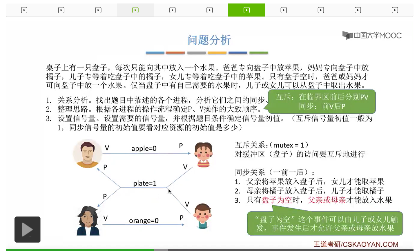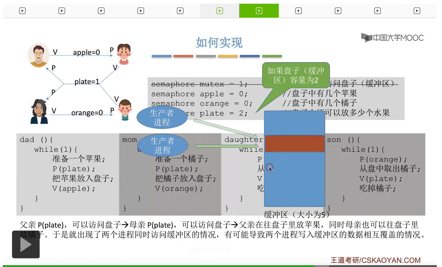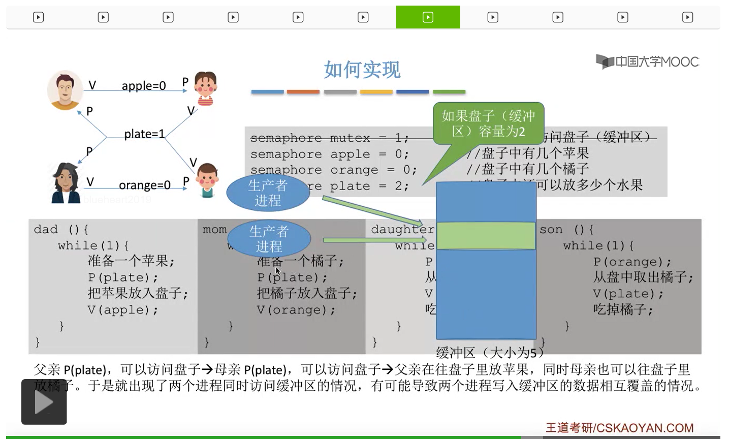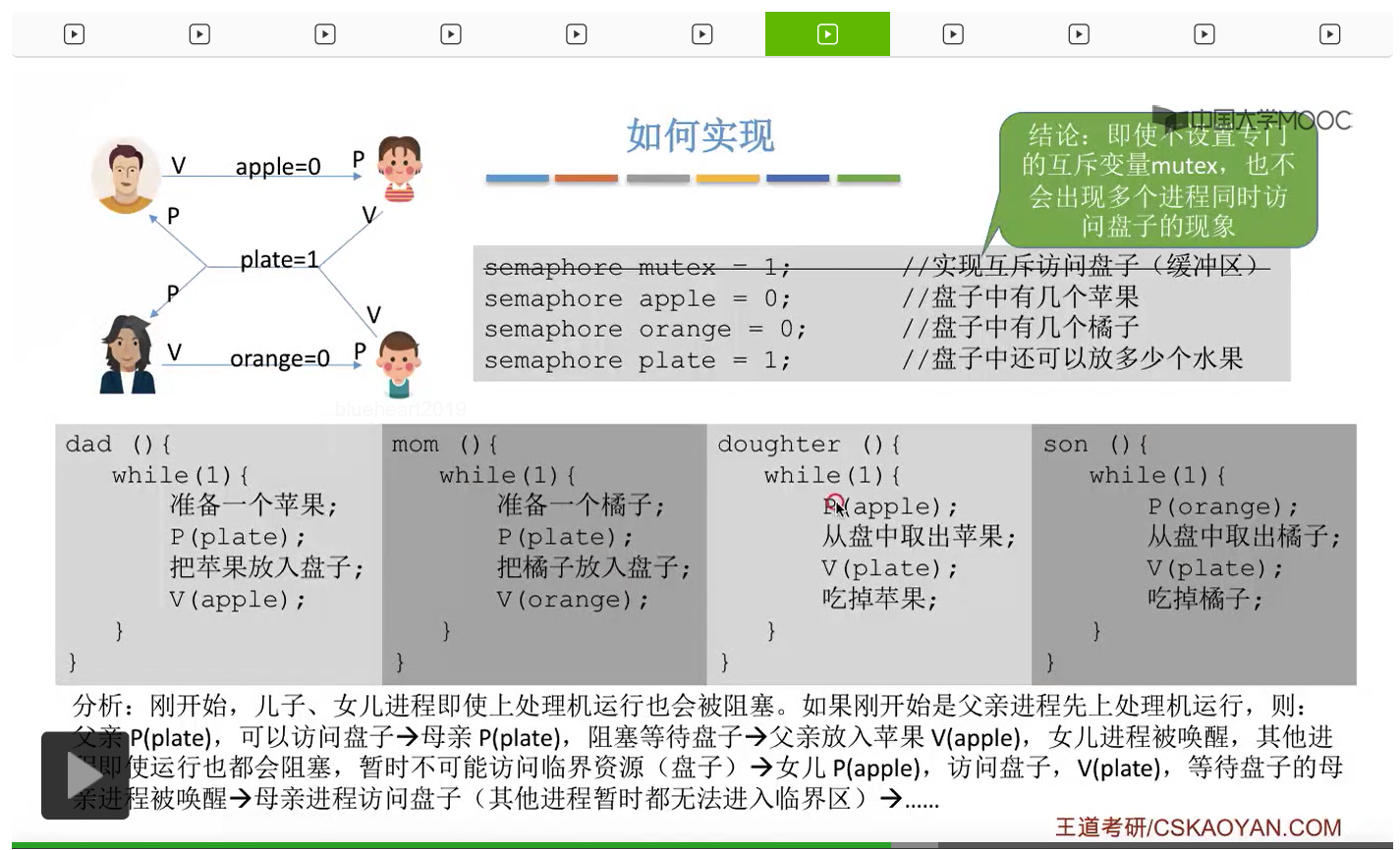 而上一节我们聊过,对于缓冲区的访问,一般来说都需要互斥地进行,所以我们需要实现对盘子这种缓冲区的互斥访问。另外,是否存在这种一前一后的同步关系呢?首先父亲要将苹果放入盘子之后,女儿才能取到苹果,所以父亲进程和女儿进程它们之间有一对同步关系。另外,母亲要把橘子放入盘子之后,儿子才可以取到橘子,所以他们两之间也存在一对同步关系。第三,只有盘子为空的时候,父亲或母亲才可以把水果放到盘子当中,而这个地方的盘子为空这个事件,其实既可以由儿子触发,也可以由女儿触发。假如说盘子里放的是橘子,那么盘子为空这个事件就应该由儿子来触发,由儿子取走橘子。而如果说盘子里放的是苹果的话,那就应该由女儿取走苹果,然后由女儿来触发盘子为空这个事件。而只有盘子为空这个事件发生之后,才能允许父亲进程或者母亲进程往盘子里放入水果。我们知道实现互斥其实很简单,无非就是在访问这个临界资源之前和访问临界资源之后,分别对互斥变量实行一个P操作和一个V操作。而实现同步关系其实我们之前也说过,我们只需要遵循一个原则,就是所谓的前V后P,也就是前面的这个事件发生了之后,我们需要执行一个V操作,而后面的这个事件发生之前,我们需要执行一个P操作。