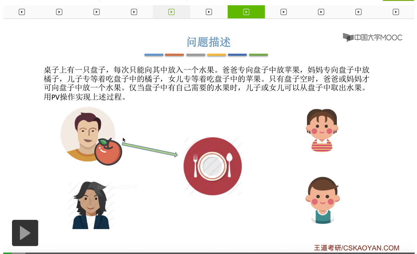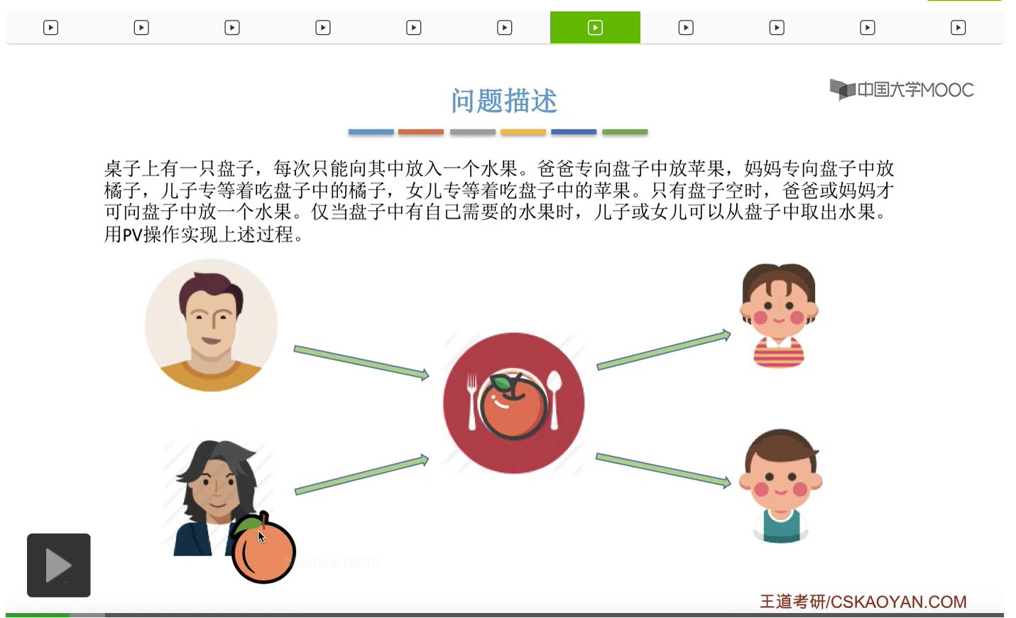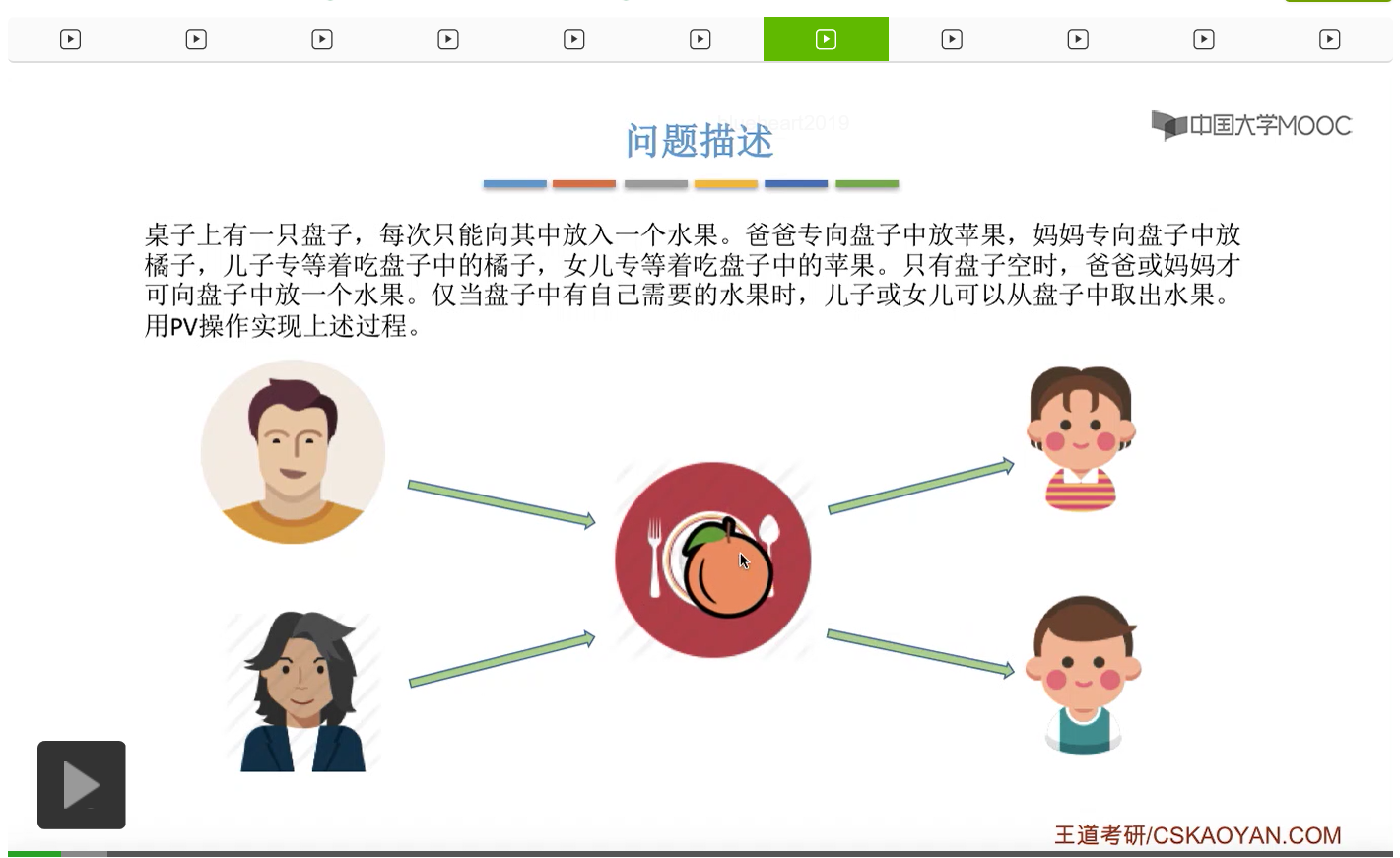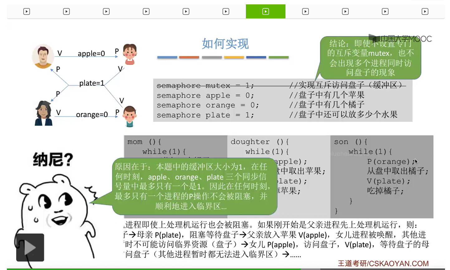 而上一节我们聊过,对于缓冲区的访问,一般来说都需要互斥地进行,所以我们需要实现对盘子这种缓冲区的互斥访问。另外,是否存在这种一前一后的同步关系呢?首先父亲要将苹果放入盘子之后,女儿才能取到苹果,所以父亲进程和女儿进程它们之间有一对同步关系。另外,母亲要把橘子放入盘子之后,儿子才可以取到橘子,所以他们两之间也存在一对同步关系。第三,只有盘子为空的时候,父亲或母亲才可以把水果放到盘子当中,而这个地方的盘子为空这个事件,其实既可以由儿子触发,也可以由女儿触发。假如说盘子里放的是橘子,那么盘子为空这个事件就应该由儿子来触发,由儿子取走橘子。而如果说盘子里放的是苹果的话,那就应该由女儿取走苹果,然后由女儿来触发盘子为空这个事件。而只有盘子为空这个事件发生之后,才能允许父亲进程或者母亲进程往盘子里放入水果。我们知道实现互斥其实很简单,无非就是在访问这个临界资源之前和访问临界资源之后,分别对互斥变量实行一个P操作和一个V操作。而实现同步关系其实我们之前也说过,我们只需要遵循一个原则,就是所谓的前V后P,也就是前面的这个事件发生了之后,我们需要执行一个V操作,而后面的这个事件发生之前,我们需要执行一个P操作。