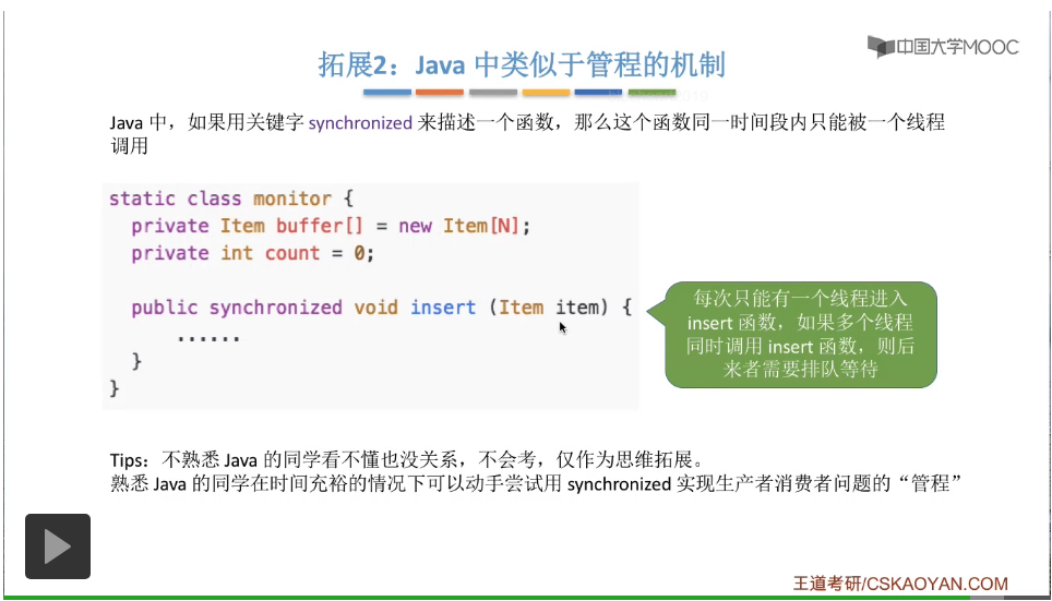 如果熟悉Java的同学在时间允许的情况下其实也可以自己动手用这个关键字来尝试实现一下生产者-消费者问题当中的管程到底应该怎么定义。