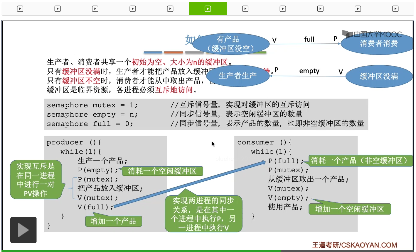 那接下来就是代码的实现。生产者进程在把产品放入缓冲区之前,需要申请一个空闲的缓冲区,因此当它放入产品之前,需要对empty这个同步信号量执行一个P操作。而当它把产品放入缓冲区之后,其实就相当于产品这一种资源的数量加1了,或者说非空缓冲区的数量加1了,因此当它放入产品之后需要对这个信号量执行一个V操作,表示增加一个这种资源。而消费者进程的分析也类似,当它从缓冲区取走一个产品之前,需要先对这个full变量进行一个P操作,也就是要申请消耗一个产品这种资源。而当它取走了一个产品之后,空闲缓冲区的数量就会加1,因此在这个操作之后需要对empty进行一个V操作,表示要增加一个空闲缓冲区。那这样我们就实现了两对同步关系。另外题目中要求缓冲区必须互斥地访问,它是临界资源,所以在访问缓冲区前后分别要对mutex这个互斥信号量执行P和V操作,用于实现对缓冲区的互斥访问。实现互斥的P、V操作,它是在同一个进程内进行的。这个进程对临界区上了锁,而当它访问完临界区之后,又需要对这个临界区进行解锁,所以这个P、V操作是在同一个进程的代码当中实现的。而同步关系就不一样了,生产者进程里边是对full变量执行了V操作,而消费者进程里边是对full变量执行了P操作,也就是对同一个变量的P、V这两个操作,是分别需要在不同的两个进程之间执行的。执行V操作的这个进程,会唤醒相对应的执行P操作的这个进程。自己体会一下前V后P。