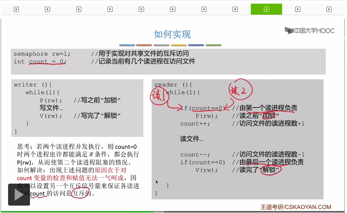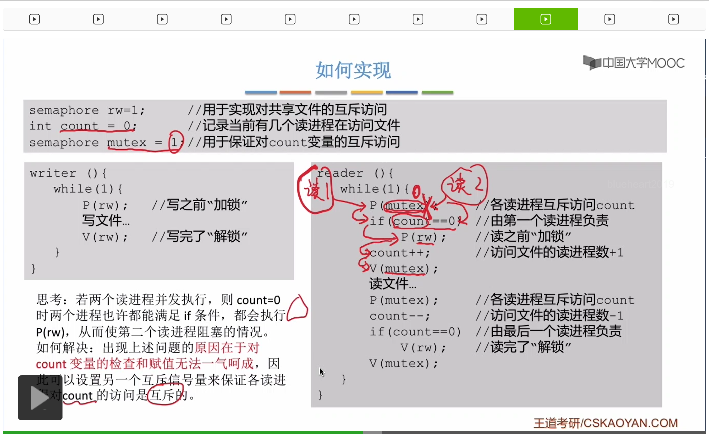 那導致這個問題的原因在於我們對count變量的檢查和賦值這兩個操作沒有辦法一氣呵成。當一個讀進程對count的值進行檢查之後,有可能切換成第二個讀進程,它也進行檢查操作,那這樣的話就會出現問題。那爲了解決這種無法一氣呵成的問題,我們應該很自然地想到我們可以讓各個讀進程互斥地來訪問count這個變量,