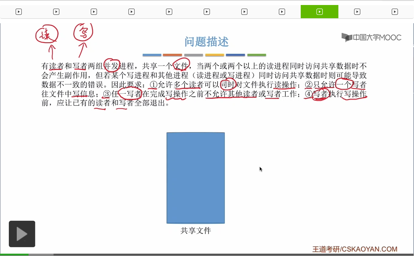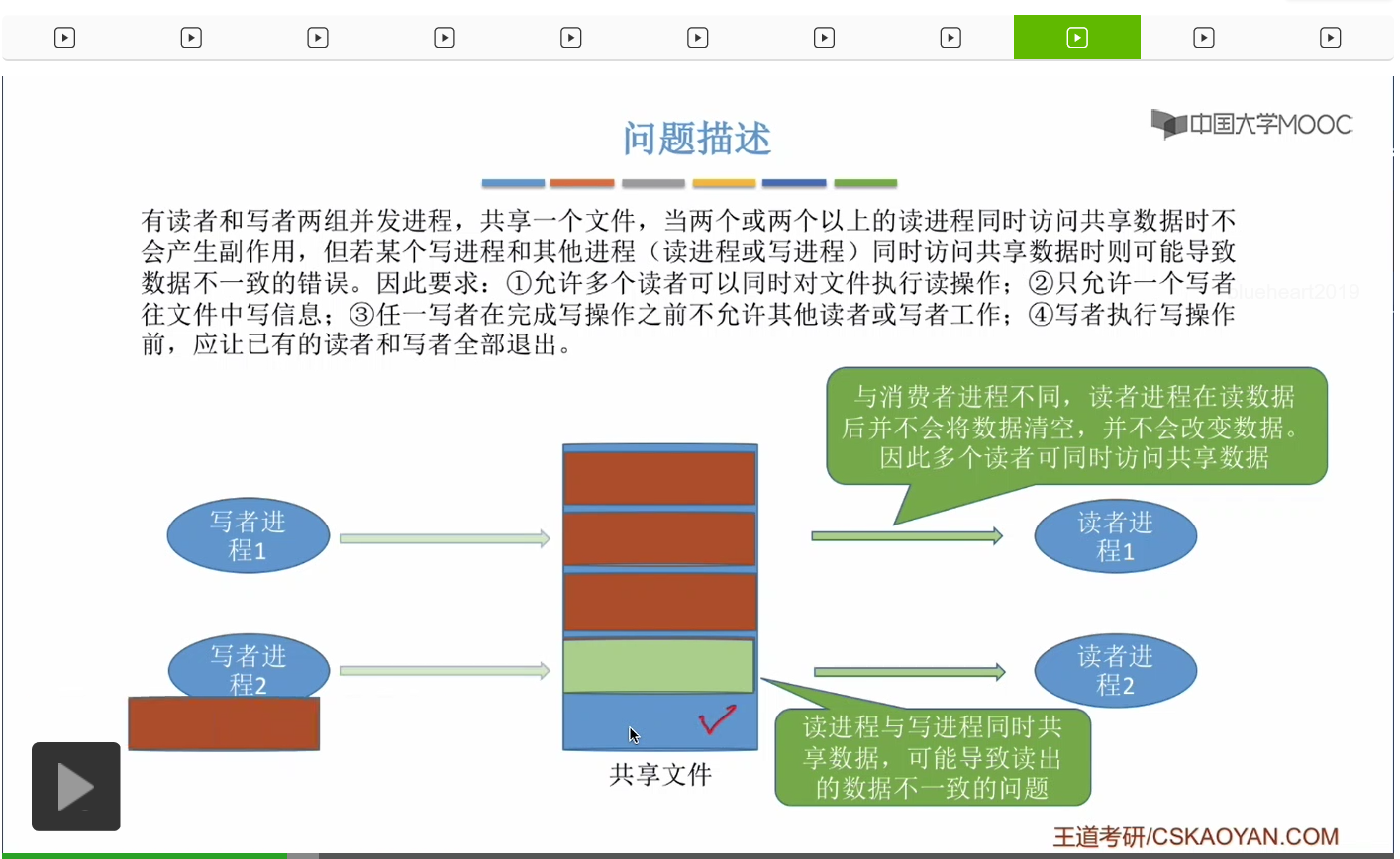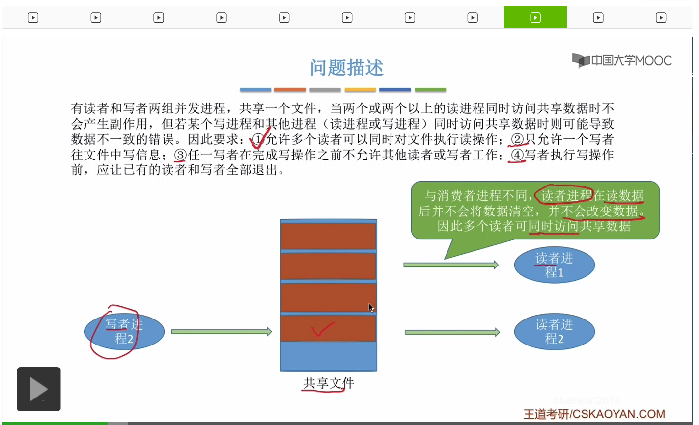 因此由於寫者進程它會改變這個共享文件的内容,所以寫者進程是不可以和其他進程同時訪問這個共享文件的。