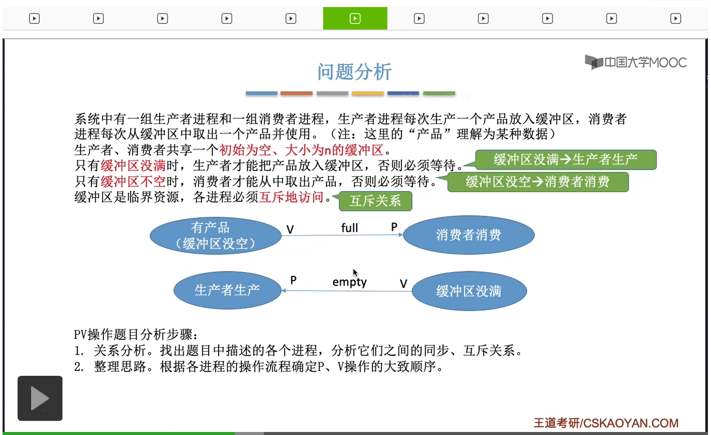 第一对是前V后P。只有当缓冲区里有产品的时候,消费者进程它才可以消费。另外呢只有缓冲区没满的时候,生产者进程才可以生产,所以这样的两对一前一后的同步关系,我们就需要给它们分别设置一个同步信号量,并且在前面这个动作完成之后,需要对这个同步信号量执行一个V操作,在后面这个动作开始之前,需要对这个同步信号量执行一个P操作。那我们一会来解释一下这两个同步信号量它在背后的含义。那这是这两对同步关系里边PV操作的一个大致顺序。