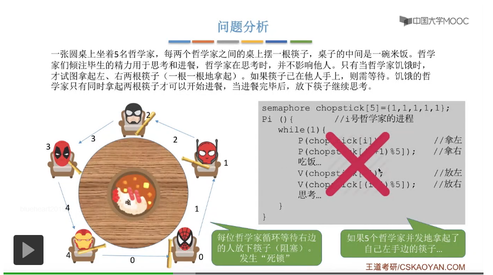 那这个题目和咱们之前介绍过的那些互斥问题不太一样的是,每一位哲学家他需要拿起两根筷子也就是两个临界资源他才可以正常地开始执行吃饭这件事。而咱们在介绍之前的那些互斥问题当中,每一个进程一般都说都只需要持有一个临界资源就可以顺利地执行了,所以这是哲学家问题和之前的那些互斥问题不同的地方。由于每一位哲学家都需要同时持有两个临界资源他才可以顺利地执行吃饭这件事情,所以如果说我们对这些临界资源的分配不当的话,那么这些哲学家进程有可能会发生死锁的现象,所以这也是哲学家问题最主要要解决的问题,怎么避免死锁。