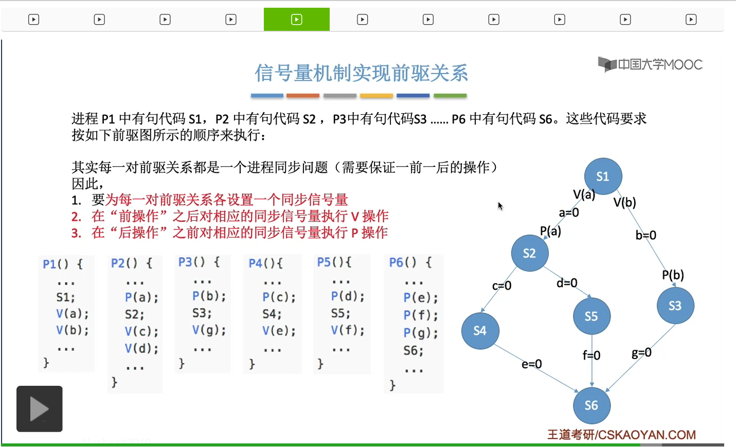 我们来看一下怎么利用这个技巧来解决更复杂的进程同步问题。我们的课本上专门讲了一个叫做进程的前驱关系。只有S1这个事件发生了之后,或者说只有S1这个代码执行了之后,才能执行S2和S3。而只有执行了S2之后,才可以执行S4和S5。另外,只有执行了S3、S4和S5之后,才能执行S6。那我们假设这几句代码分别是P1、P2、P3、P4一直到P6这几个进程需要执行的。那我们来看一下怎么用信号量机制解决这么复杂的进程之间的同步问题。