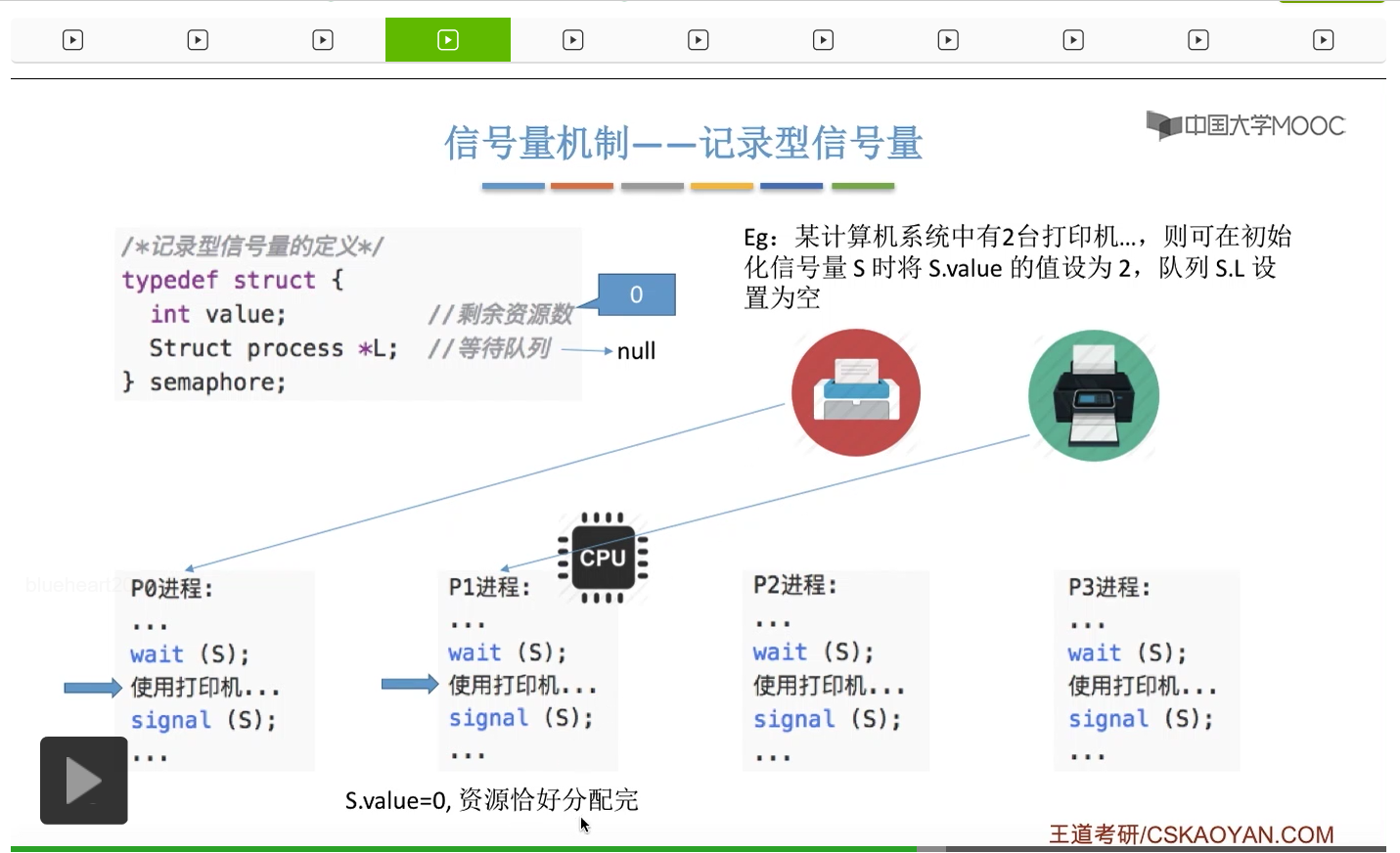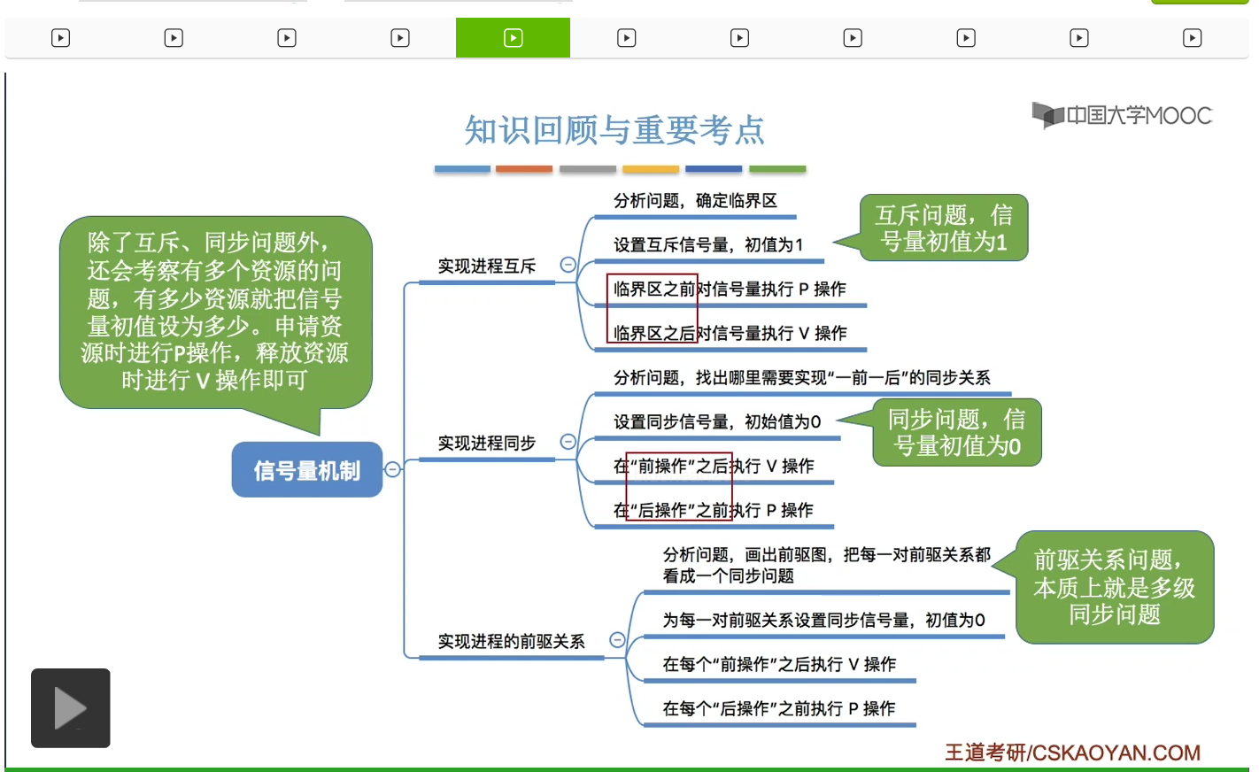 好的那么这个小节中我们介绍了很重要的知识点,怎么用信号量机制实现进程的互斥、同步。几乎每一年都至少有个大题是要考察这个信号量机制实现互斥和同步的,所以对于这个小节的掌握是十分重要的。那么如果要用信号量机制实现进程互斥的话,我们可以设置一个初始值为1的互斥信号量,并且在临界区之前执行P操作,临界区之后执行V操作。而如果要实现进程的同步的话,那么我们需要设置一个初始值为0的同步信号量。另外需要在前操作之后执行V操作,需要在后操作之前执行P操作,也就是前V后P,用这样的方式就可以保证进程之间一前一后的这种同步关系了。那这是互斥和同步问题的一个基本套路。那最后我们所介绍的进程的前驱关系,它本质上也是一个进程同步的问题,只不过它是多级的同步。那只要我们能掌握前V后P的这种技巧的话,那前驱问题其实也很好解决。那对于信号量机制的考察,除了实现互斥和同步之外,有的时候有可能会考察用信号量机制来实现资源分配的问题。比如说系统中有三个打印机,那么这种情况下我们就需要把打印机对应的那个信号量初始值设置为3,然后当一个进程需要申请使用这个资源的时候,就需要对这个资源所对应的信号量执行P操作,然后使用完了之后就需要执行V操作。那这一点其实只要掌握了信号量它在背后所表示的逻辑也并不难理解。