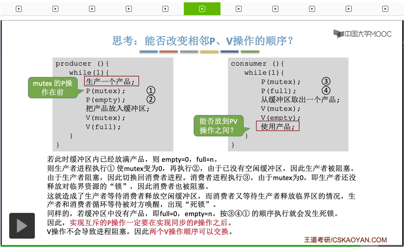 这种情况就是我们之后会学习到的死锁。进程和进程之间发生了循环等待,被对方唤醒这样的一个神奇的情况。V操作的顺序颠倒是不会出现问题的,因为V操作并不会导致任何一个进程阻塞,所以它们俩个顺序颠倒并不会发生这种循环等待的问题,所以俩个V操作的顺序是可以交换的。生产者生产一个产品和消费者使用一个产品是否可以放到PV操作之间呢?其实逻辑上看是可以放到PV操作这里边的,但是如果我们把这两部分的处理都放到PV操作里边的话,那么就会导致临界区代码变得更长,也就是说一个进程对临界区上锁的时间会增长,那这样的话肯定不利于各个进程交替地来使用这个临界区资源,所以我们要让临界区的代码尽可能地短,因此逻辑上来看,把这两个部分放进去是没有问题的,但是实际上会对系统的效能产生影响,因此并不建议把这两个部分的操作放到PV操作里边。