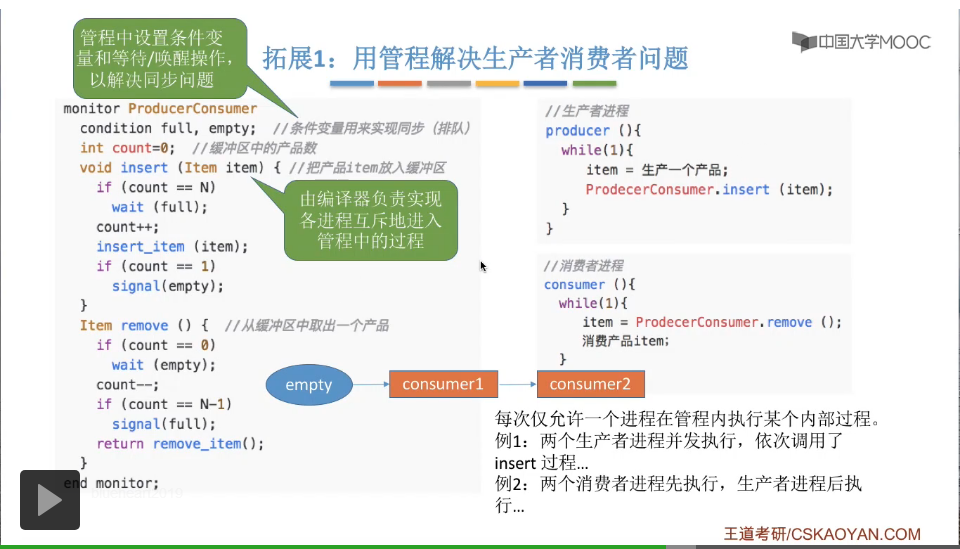 那接下來我們用一個具體的例子看一下管程是怎麽解決生產者-消費者問題的?需要注意的是在這個地方并沒有按照某一種嚴格的語法規則來進行表述,這個地方只是爲了讓大家容易能夠理解,所以用了類C語言的僞代碼來表示管程當中的這一系列邏輯。我們可以用程序設計語言當中提供的某一種特殊的語法,比如說monitor,end monitor,用這樣一對關鍵字來定義一個管程,就是指中間的這個部分就是管程的内容。那管程的名字叫ProducerConsumer。另外我們可以定義一些條件變量用来實現同步,還可以定義一些普通的變量,用來表示我們想要記錄的信息,比如說緩衝區當中的產品個數。那除此之外我们还需要定义对缓冲区进行描述的一些数据结构,不过为了方便我们这儿就省去了。那生产者进程想往缓冲区里放入一个自己新生产的产品,可以直接调用管程当中定义的这个insert函数就可以实现。像之前咱们用PV操作的时候,生产者进程需要有一堆PV操作,但如果采用了管程,那这个代码就变得特别简洁。首先,就是生产一个产品。之后,就是定义这个管程当中的insert函数,然后把自己生产的这个产品作为这个函数的参数传进去。那接下来的问题,生产者进程就不用管了。接下来就由管程来负责解决剩下的什么同步啊互斥啊一系列很复杂的问题。同样的,消费者进程也可以很简单地调用管程当中定义的某一个函数就可以实现从缓冲区当中取出一个产品这样的事情,所以消费者进程的代码也变得非常简洁。而从缓冲区当中取出一个产品的时候,缓冲区空了怎么办?还有对缓冲区的互斥怎么办?这些消费者进程都不用关心,剩下的都是管程会负责解决的问题。我们定义了管程之后,在编译的时候其实会由编译器负责实现各个进程互斥地进入管程当中的过程这样一件事情。举个例子,比如说有两个生产者进程并发地执行,并且先后都调用了管程的insert这个过程,或者说insert这个函数,那么由于刚开始没有任何一个进程正在访问这个管程当中的某一个函数,所以第一个生产者进程在调用insert函数的时候是可以顺利地执行下去的。它会执行完一系列代码,包括判断缓冲区是否满了,或者此时是否有一些消费者进程需要唤醒,这一系列的事情都是在管程的insert函数里面进行完成的。而如果在第一个进程没有执行完这个函数相应的这一系列逻辑的时候,第二个进程就尝试着也想调用insert函数。那么由于编译器实现的这些功能,它会暂时阻止第二个进程进入insert函数,所以就会把第二个进程阻塞在insert函数后面,就类似于一个排队器,让它先等待,等第一个进程访问完了insert函数之后,才会让第二个进程开始进入insert函数,然后执行相应的这一系列逻辑。所以互斥地使用某一些共享数据,这是由编译器负责为我们实现的,程序员在写程序的时候不需要再关心如何实现互斥,只需要直接调用管程提供的这一系列的方法,其实它本身就已经能够保证这是互斥地进行的。那除了互斥之外,管程还可以实现进程的同步。我们可以在管程当中设置一些条件变量,比如在这个地方我们设置了full和empty这两个条件变量。还有与它们对应的等待和唤醒操作,用来实现进程的同步问题。比如说如果有两个消费者进程先执行,生产者进程后执行,那么第一个消费者进程在执行的时候首先是调用了这个管程的remove这个过程,或者说这个函数。那首先需要判断此时缓冲区里是否有可用的产品,那由于刚开始count的值本来就是零,所以第一个消费者进程需要执行wait,也就是等待操作。于是第一个消费者进程会等待在empty这个条件变量相关的这个队列当中。同样的,第二个进程开始执行remove函数的时候,也会发现此时count的值是零,所以它也需要执行这个等待操作。同样的,也会插入到empty这个条件变量对应的队尾,就像这个样子。那之后如果有一个生产者进程开始执行,那它会执行这个管程的insert函数或者说这个过程,那么它会把它自己生产的产品放入到缓冲区当中,并且会检查自己放入的这个产品是不是这个缓冲区当中的第一个产品。那如果说是第一个产品的话,那么就意味着此时有可能有别的消费者进程正在等待我的这个产品,所以接下来这个生产者进程在执行insert函数的时候也会在其中执行一个唤醒操作——signal操作,用于唤醒等待在empty这个条件变量对应的等待队列当中的某一个进程。那一般来说都是唤醒排在队头的这个进程,也就是第一个消费者进程。那由于第一个消费者进程被唤醒了之后,它就可以开始往下执行,首先是执行count--,就是让count的值由1又变回了0,然后再检查在自己取走这个产品之前,缓冲区是不是已经满了,如果说缓冲区之前是已经是满的,那么就意味着有可能会有生产者进程需要被唤醒。于是这个消费者进程又会调用一个对full这个条件变量的signal也就是唤醒操作,那原理呢和刚才咱们介绍empty这个的原理其实是一样的。那最后remove函数会返回一个消费者进程想要的产品对应的一个指针。所以第一个消费者进程就可以通过这样一个步骤就可以取出它想要的产品。而在取产品的过程当中,如何实现对缓冲区的互斥访问,或者当缓冲区当中没有产品的时候自己的这个消费者进程应该怎么处理,这一些都不需要消费者进程再来关心,这一些都是由管程负责解决的。在采用了管程这种机制之后,实现进程的互斥和