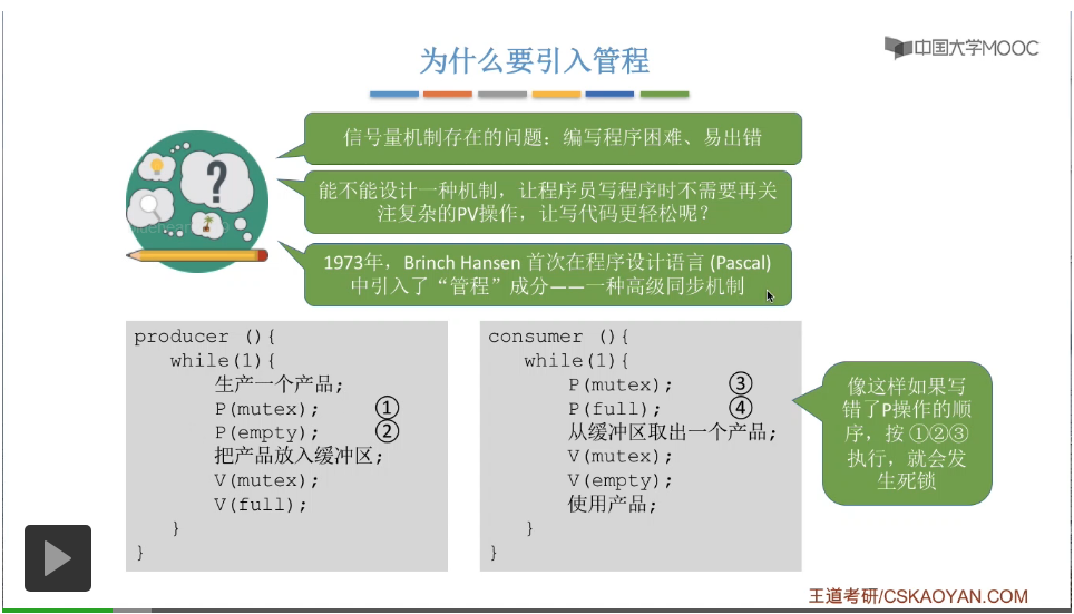 那么首先来看一下为什么要引入管程?在管程引入之前,其实人们用来实现进程同步和互斥,主要是使用信号量机制,就是咱们之前学过的那种PV操作。但是信号量机制存在的问题就是编写程序困难、易出错,这点大家在做题的时候应该也有体会过。比如说咱们在生产者-消费者问题当中提到过,如果说实现互斥的P操作在实现同步的P操作之前,那么就有可能会引起死锁的状态。我们在使用信号量机制的时候,就不得不关心这些PV操作的顺序,这就造成了我们在编写程序的时候很困难,并且极易出错的这种问题。管程,其实它是一种高级的同步机制,它本质上也是用于实现进程的互斥同步的,只不过它比之前的这种信号量机制要更方便易用一些,是一种更高级的同步机制。