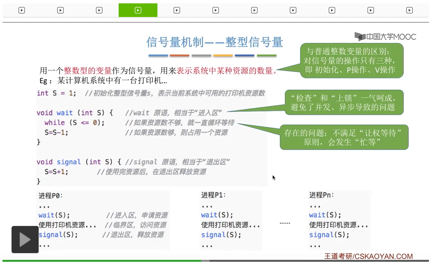 整型信号量在wait这个原语当中的这两个操作其实逻辑上来看和双标志先检查法当中先检查后上锁其实做的是一样的事情,大家可以对比着来串联一下这两个知识点。那么因为它是用一个原语来实现的检查和上锁,所以它这两个操作一气呵成,就避免了双标志先检查法那种就是两个进程同时进入临界区的问题。如果一个进程暂时进不了临界区,也就意味着它被卡在wait这个原语的这个while循环里,那么既然wait原语它是不可被中断的,那么也就意味着当前正在执行while循环的这个进程是不是一直不会被切换呢?这个地方确实是一个让人感觉不太严谨的地方。但是我们在很多经典的教材当中,其实它们都是这么写的,所以这个地方我们姑且认为它没有问题,不会导致一个进程一直占用处理机的情况吧。那在整型信号量当中其实比较容易考察的是它存在的问题这一点,经常会把这个整型信号量和记录型的信号量做对比。那么它俩的区别就在于整型信号量不满足“让权等待”,会发生忙等。