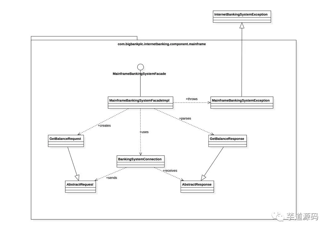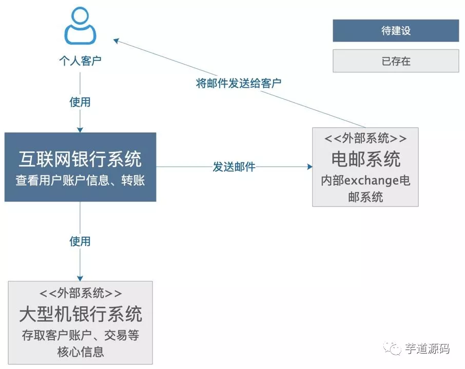 这是一个想象的待建设的互联网银行系统,它使用外部的大型机银行系统存取客户账户、交易信息,通过外部电邮系统给客户发邮件。可以看到,非常简单、清晰,相信不需要解释,都看的明白,里面包含了需要建设的系统本身,系统的客户,和这个系统有交互的周边系统。