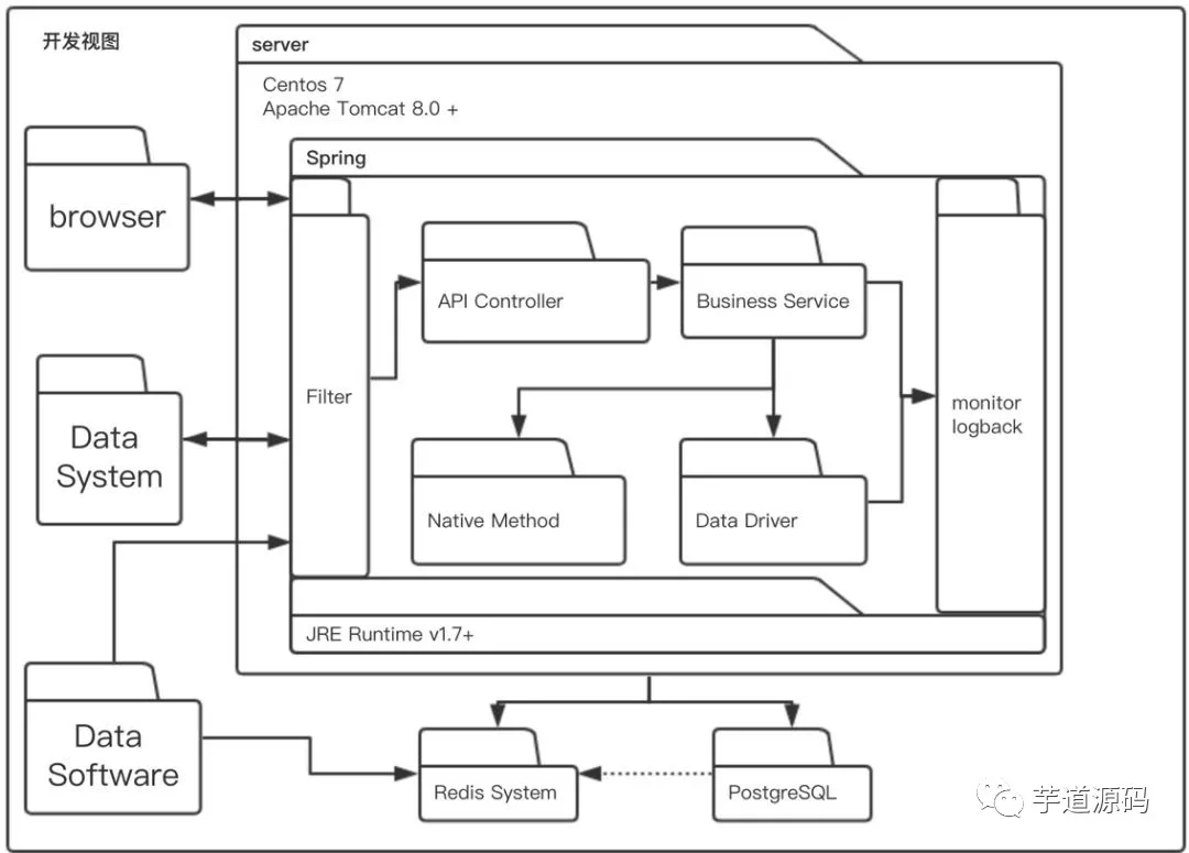 开发视图用于描述系统的模块划分和组成,以及细化到内部包的组成设计,服务于开发人员,反映系统开发实施过程。