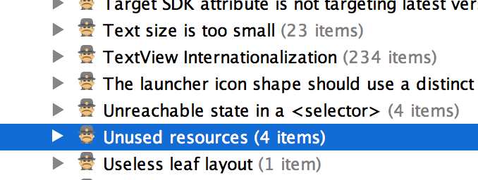 1. 既然是瘦身, 那无效资源引用就是头等重要的事了. 个人觉得这部分都在Inpsection模块的Android Lint视图里面了.