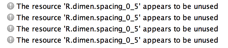 Android Lint信誓旦旦的说, R.dimen.spacing_0_5是没用的(实际上他的名字是R.dimen.spacing_0.5...) 后删之, 保留了values-1280x720目录下diemns.xml里的R.dimen.spacing_0.5定义...