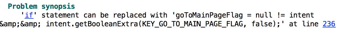 结论: 把六行的代码改成两行, 确实是一个很好的Code Style实践有没有! 是的, Android Studio的Inspect Code功能我也是第一次用, 里面东西实在太多了, 大大小小事无巨细的, 没事儿多看看长长见识也是极好的... 虽然有时候你可能不能在短时间内一下子把所有选项优化完, 不过多看才会有优化的意识, 在之后的Code实践里就会逐渐的靠近最佳实践. (完)