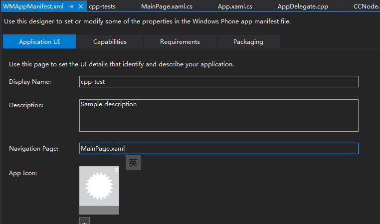 在 cpp-tests 中,app.xaml.cs 是标准的应用程序入口。与普通的 Windows Phone 应用并没有什么不同。