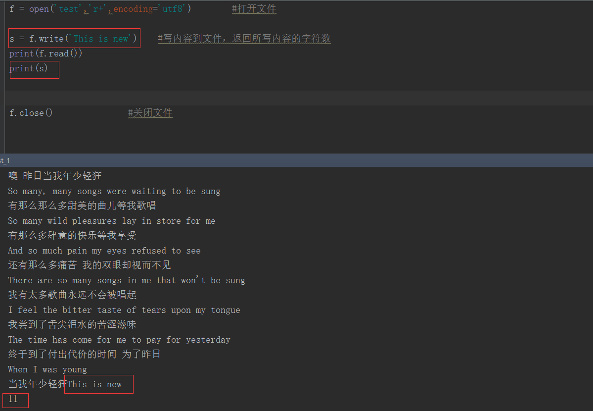 f.write(string) 将 string 写入到文件中, 然后返回写入的字符数。