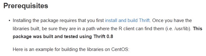 安装rhbase-1.1.1(参见https://github.com/RevolutionAnalytics/RHadoop/wiki/rhbase)。在安装rhbase之前,还需要安装Thrift库,建议安装版本与rhbase构建及测试选用的版本相同,在rhbase的wiki页面可以看到: