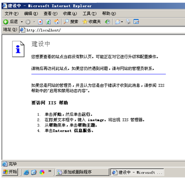 1.2.打开IE浏览器,地址栏输入http://localhost 回车,页面显示建设中表示ISS服务器安装启动成功