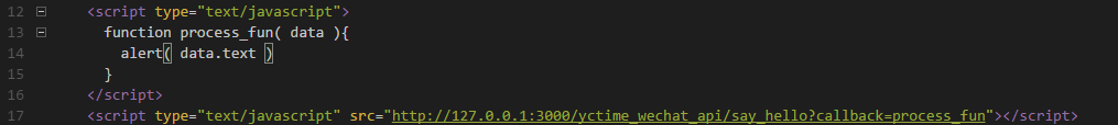 script标签跨域发起get请求,同时传递在客户端已经注册的全局函数 process_fun 作为查询参数,服务端代码提取查询参数,并传入需要返回的数据。script标签还有一个特点,就是会立即执行调用所请求到的资源,所以这个时候服务端返回的 process_fun(data) 这一句代码会被立即执行,即把数据 data 传入我们事先定义好的函数 process_fun 中执行进一步的处理。