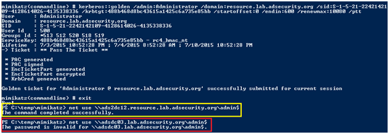 黄金票据 “欺骗”了当前域的管理权限,当KRBTGT帐户密码哈希显示在作为多域AD的林一部分的子域中时存在此局限性。因为是根(root)域包含全森林管理组Enterprise Admins。由于Mimikatz通过相对标识符(RID)向票据添加了组成员资格,因此Kerberos票据中的519(企业管理)RID在其创建的域中(基于KRBTGT帐户域)被标识为本地。如果通过获取域SID和附加RID创建的域安全标识符(SID)不存在,那么Kerberos票据的持有者不会收到该级别的访问权限。换句话说,在一个多域AD森林中,如果创建的Golden Ticket域不包含Enterprise Admins组,则Golden Ticket不会向林中的其他域提供管理权限。在单个域Active Directory林中,由于Enterprise Admins组驻留在此域中,这时创建Golden Ticket不存在局限性。