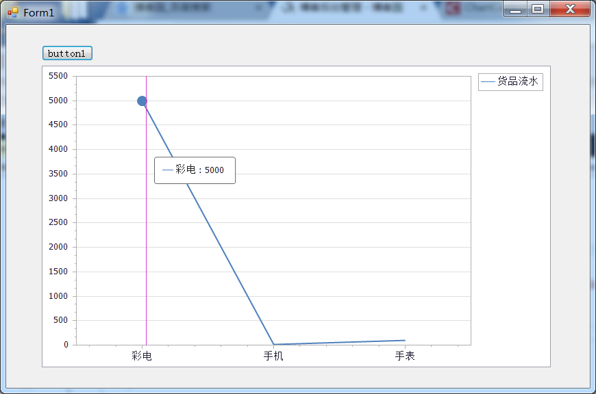 private void button1_Click(object sender, EventArgs e) { cct.Series.Clear(); //清掉原来的内容 Series s = new Series("货品流水", ViewType.Line);//建一个名为货品流水的 折线 cct.Series.Add(s);//加表chartControl中 using (SqlConnection con = new SqlConnection("server =.;uid=sa;pwd=123;database=test")) { using (SqlDataAdapter ada = new SqlDataAdapter("select * from rdrecords where id =4", con)) { DataTable dt = new DataTable(); ada.Fill(dt); SeriesPoint pt = null;//线上的一个点 foreach (DataRow dr in dt.Rows) { if (dr["invcode"] != null) { pt = new SeriesPoint(dr["invCode"].ToString()); //x轴值 pt.Values = new double[] { Convert.ToDouble(dr["Quantity"])};//y轴值 接收数组 s.Points.Add(pt); } } } } }