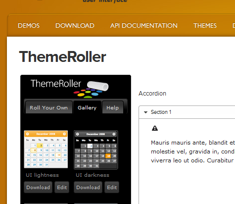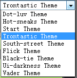 <!-- Html代码 --> <select id="theme_changer"> <option value="themes/dot-luv/jquery.ui.theme.css" selected="selected">Dot-luv Theme</option> <option value="themes/hot-sneaks/jquery.ui.theme.css" >Hot-sneaks Theme</option> <option value="themes/flick/jquery.ui.theme.css" >Flick Theme</option> <option value="themes/ui-darkness/jquery.ui.theme.css" >Ui-darkness Theme</option> <option value="themes/vader/jquery.ui.theme.css" >Vader Theme</option> </select>