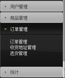 <!-- Html代码 --> <div id="accordion" class="ui-widget-content" style="height: 80%;"> <h6><a href="#">用户管理</a></h6> <div>...</div> <h6><a href="#">商品管理</a></h6> <div>...</div> <h6><a href="#">订单管理</a></h6> <div> <ul> <li><a href="#">订单管理</a></li> <li><a href="#">收货地址管理</a></li> <li><a href="#">退货管理</a></li> </ul> </div> <h6><a href="#">统计</a></h6> <div>...</div> </div>