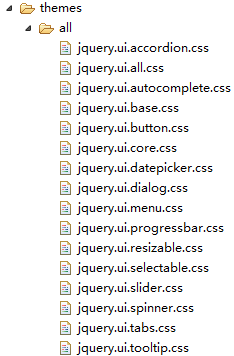 下载完后解压,在themes目录下有各个主题对应的目录,打开这些目录,你会发现各个主题就是用了不同图片和jquery.ui.theme.css这个样式文件。好了,找到关键了,那我们看一下jquery.ui.theme.css文件是在哪里引用的呢?打开jquery.ui.all.css文件就知道是这里引用了