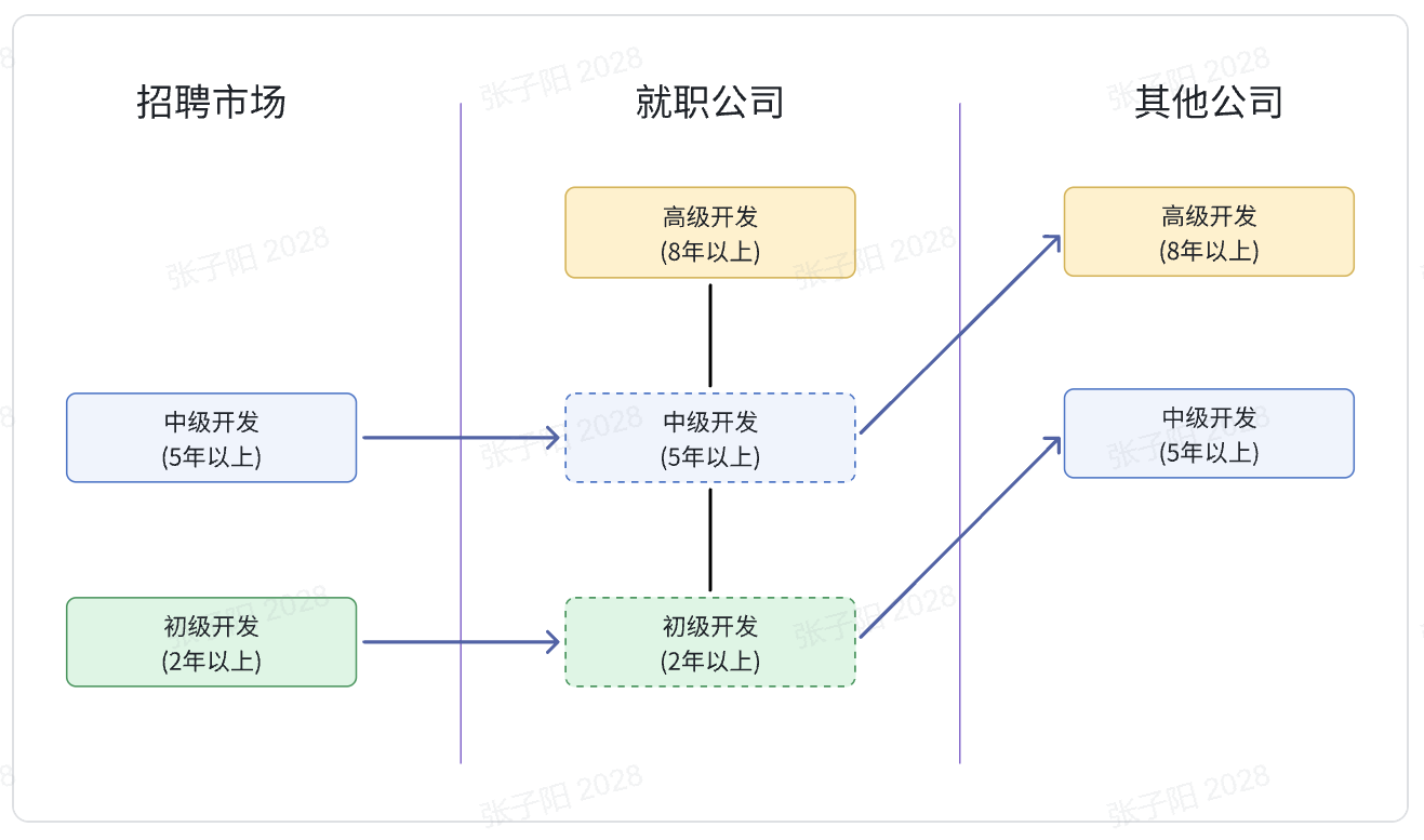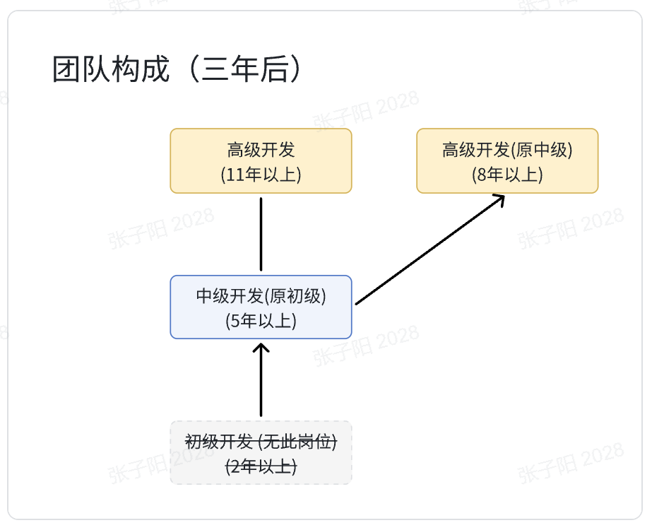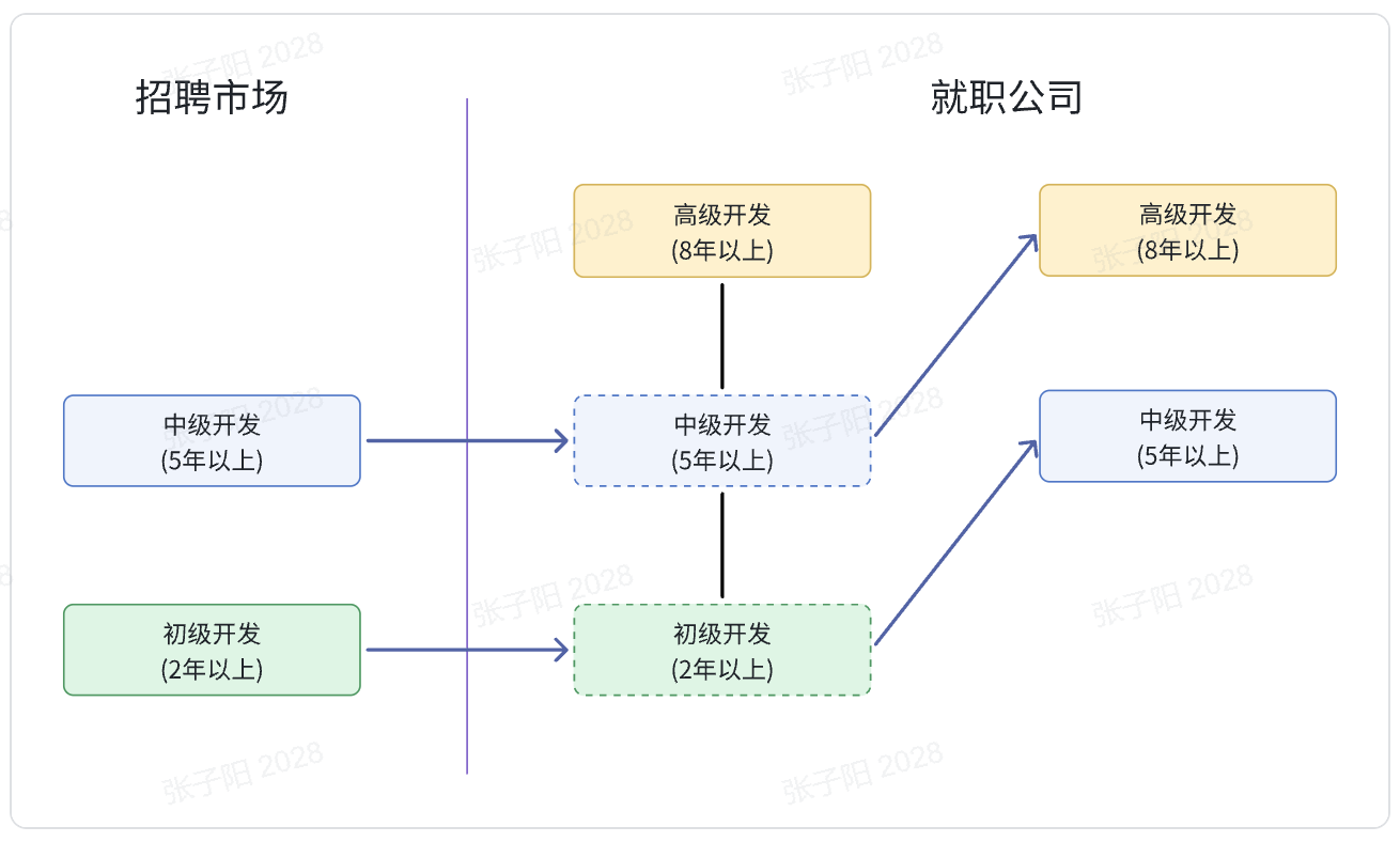过了3年的时间,之前 2年经验的初级开发,这时候已经有了5年的工作经验,他会要求升职加薪,因为个人已经成长了。类似地,之前5年经验的中级,也期望成为高级开发。