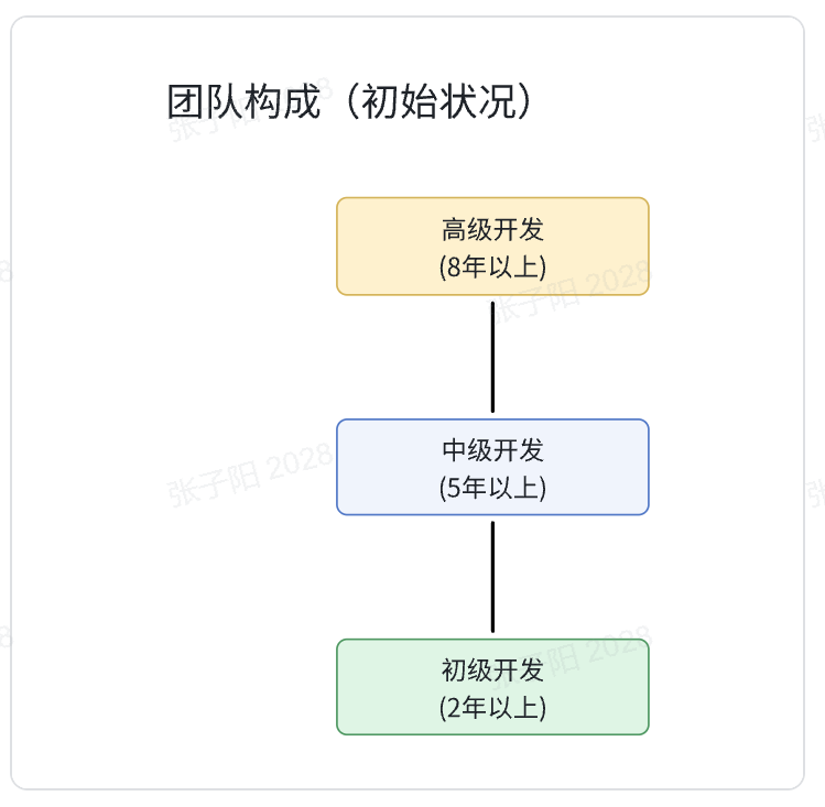 工作任务有 简单的 也有 困难的,不会全是简单工作,也不会全是困难工作。因此,从 构建团队 的角度而言,也会是:初级、中级、高级 都会有。初级人员 处理简单的任务,高级人员解决复杂和困难的问题。从而,在团队建立伊始,岗位的配置可能是这样的结构(简单起见,假设每个岗位各有一个编制):