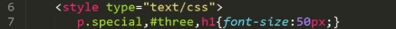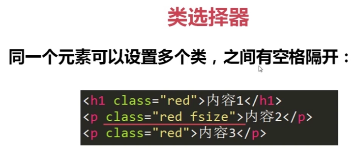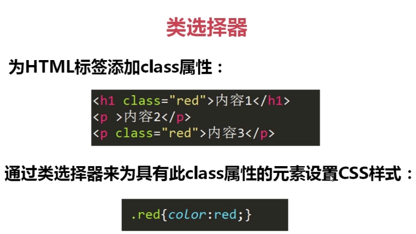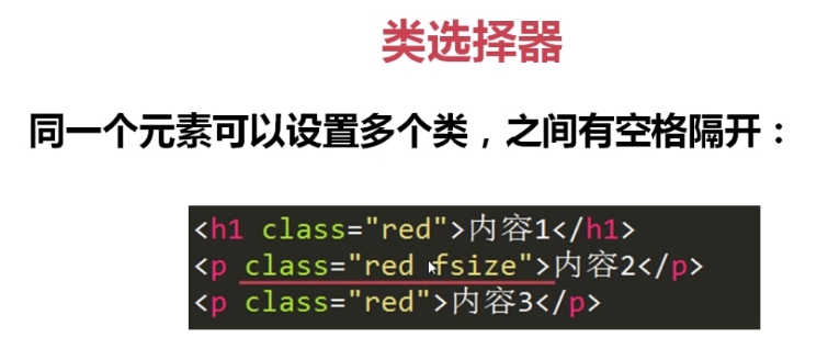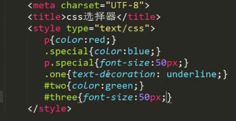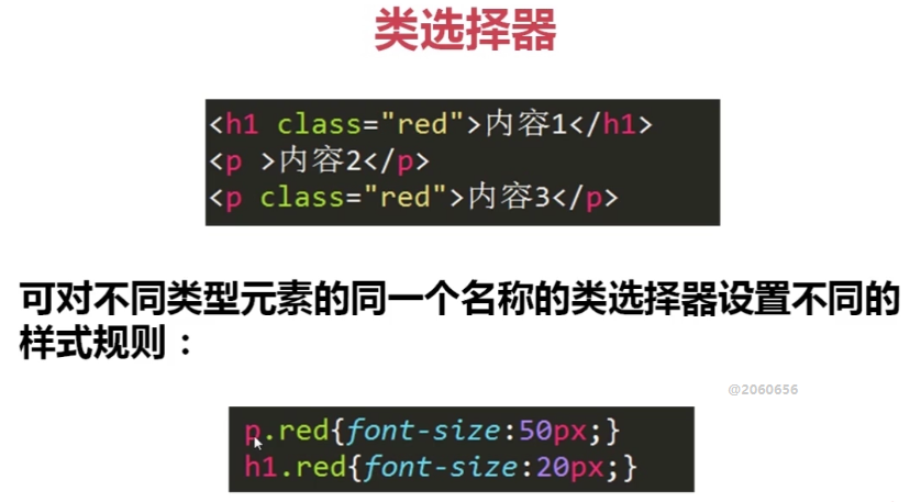 p.red{font-size:50px;} 在所有p标签中,设置有class=“red”的p标签,字体才变成50px。