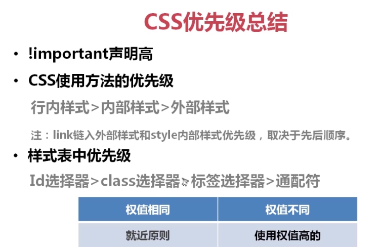 id选择器 > class选择器 > 标签选择器