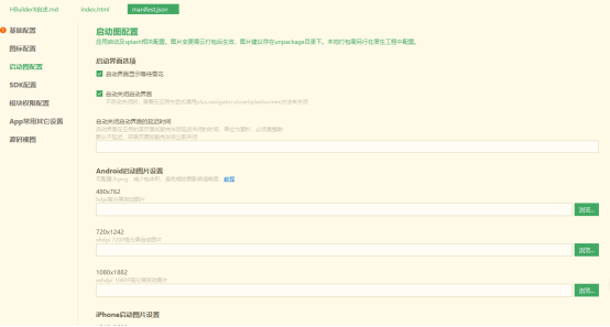 2.自动关闭启动界面,这个参数勾选以后APP程序进入主界面(也就是我们在基本配置中填写的应用入口页面index.html显示)后会关闭APP程序的启动界面。如果勾选这个参数,APP程序手机显示界面一直会显示启动界面,实质上APP程序进入了主程序,这个界面也不会消失,需要我们编写代码关闭启动界面。这个参数我们会在程序引导页的时候用到,现在我们先默认勾选。