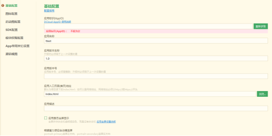 在这个管理界面中,左侧有“基本配置”、“图标配置”、“启动配置”、“SDK配置”、“模块权限配置”和“APP常用其它配置”6个可视化配置界面;一个“源码试图”,是6个可视化界面配置代码,可视化界面选择修改后的配置代码相应的跟着变动。APP相关配置,你可以在可视化界面中进行配置,也可以在代码界面进行配置。下面我们一次学习。