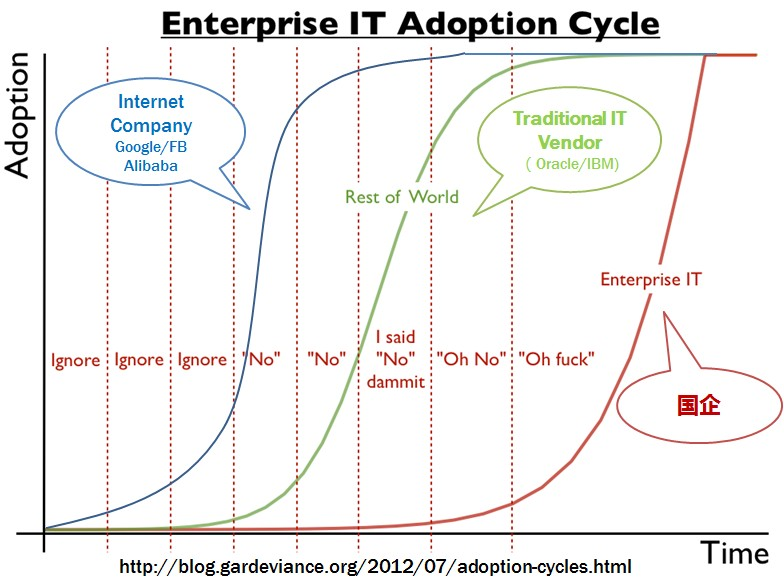 其实本来所谓的微服务就是对互联网在应用技术的一个总结归纳,IT厂商鼓吹所有概念无非是为了生意(business),SOA是,Cloud是,Microservice也是。下面玩笑很有意思的概括了这个情况(我加了第一条线,原图见这里)
