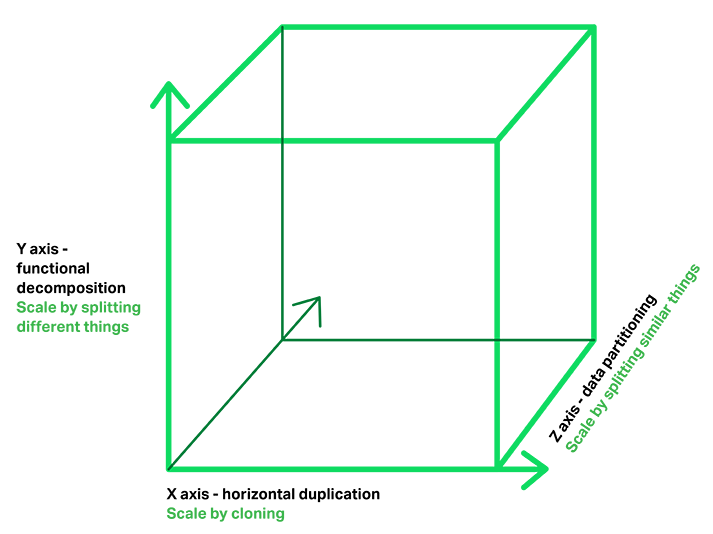 用《The art of scalability》一书里提到的scale cube比较容易理解如何拆分。你看,我们叫分库分表,别人总结成了scale cube,这就是抽象的能力啊,把复杂的东西用最简单的概念解释和总结。X轴代表运行多个负载均衡器之后运行的实例,Y轴代表将应用进一步分解为微服务(分库),数据量大时,还可以用Z轴将服务按数据分区(分表)