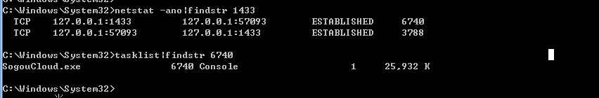 依次点开报错发现第一条是1433端口被占用,于是找相关的进程: