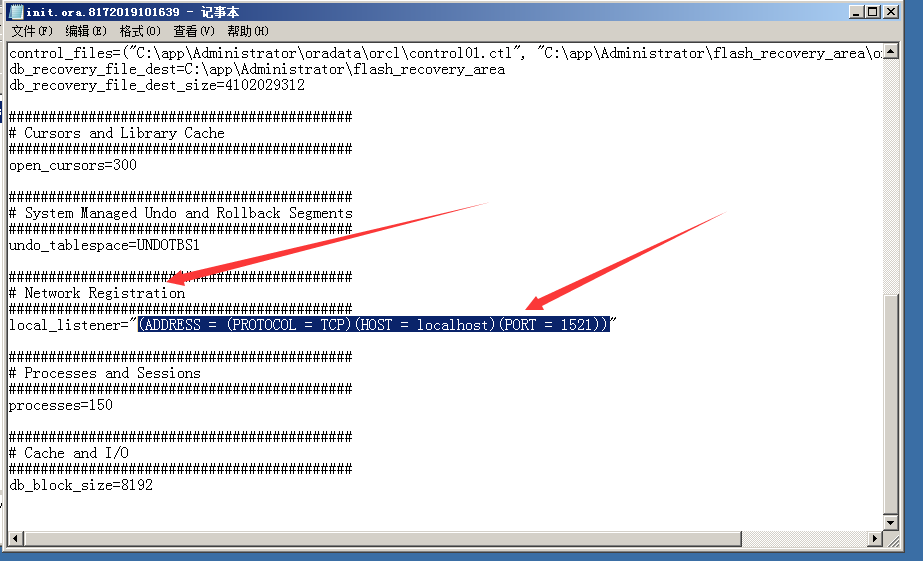 找到Network Registration,修改下面的local_listener="(ADDRESS = (PROTOCOL = TCP)(HOST = localhost)(PORT = 1521))",这个 (ADDRESS = (PROTOCOL = TCP)(HOST = localhost)(PORT = 1521)) 内容可以从C:\app\Administrator\product\11.2.0\dbhome_1\NETWORK\ADMIN\tnsnames.ora文件找到